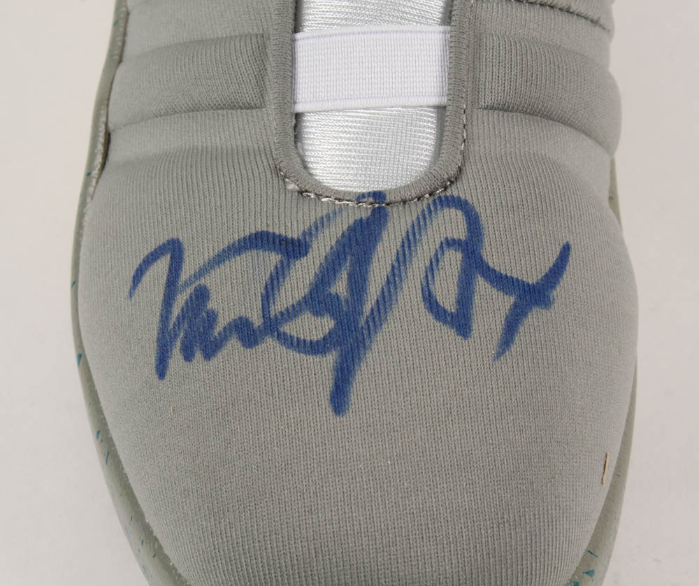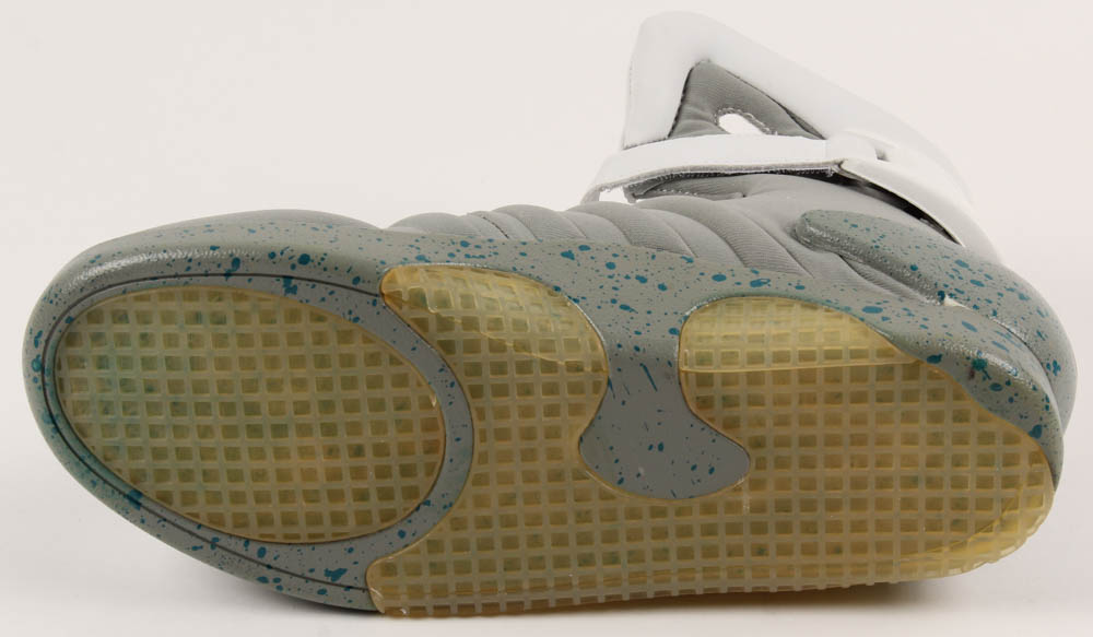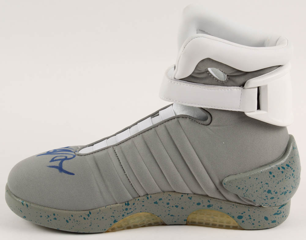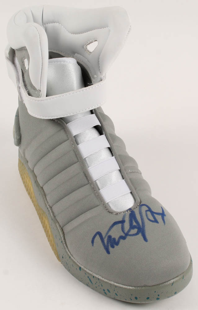 This full-size shoe is a licensed Back to the Future product and represents the shoe seen on screen. Hand-signed in black felt-tip pen by Michael J. Fox (Marty McFly). The shoe does not indicate a size but appears to be a mens 12-13. The shoe features a velcro strap. The shoe does not self-lace.