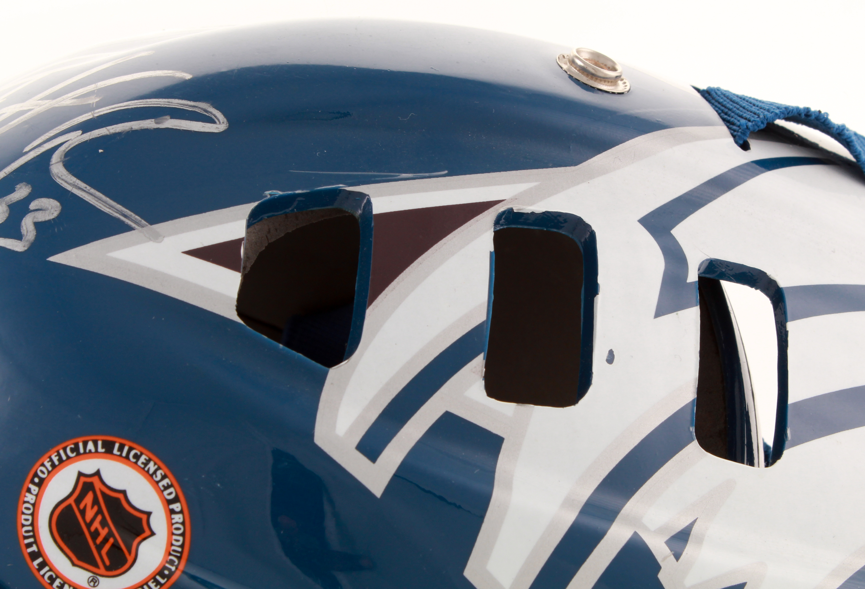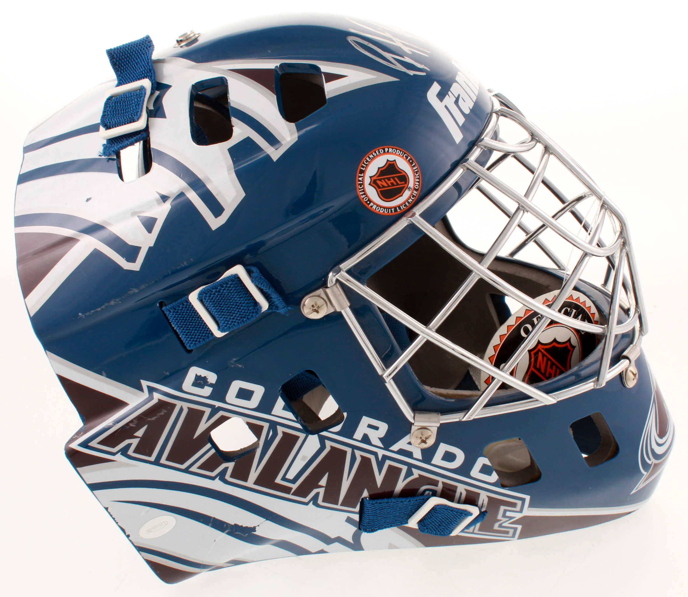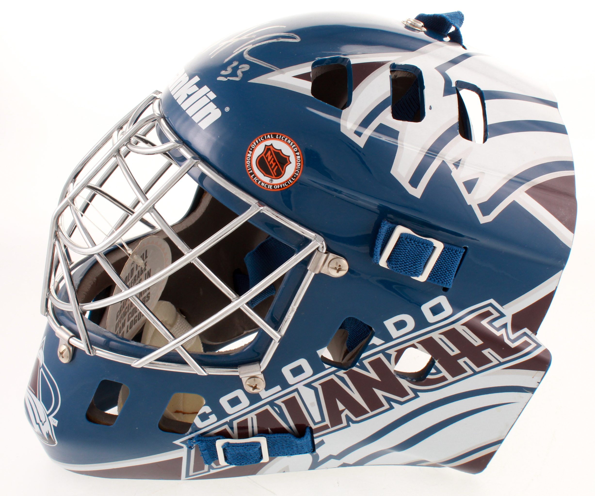 Franklin full-size replica Colorado Avalanche goalie mask. Hand-signed in silver paint pen by Patrick Roy (HOF). Please see images for details regarding the condition of the helmet.