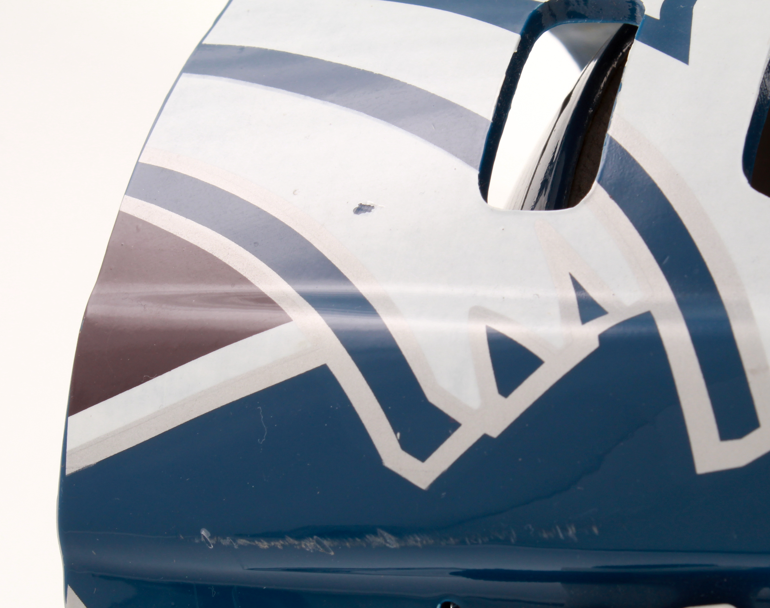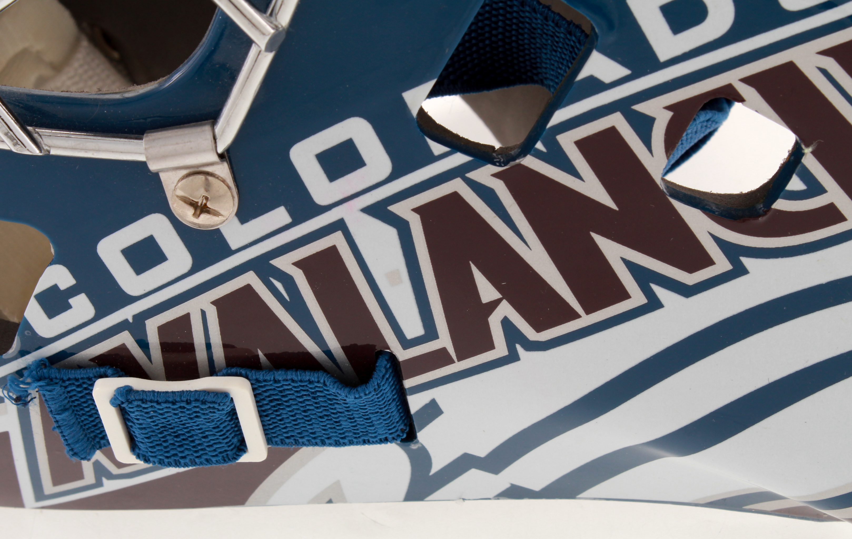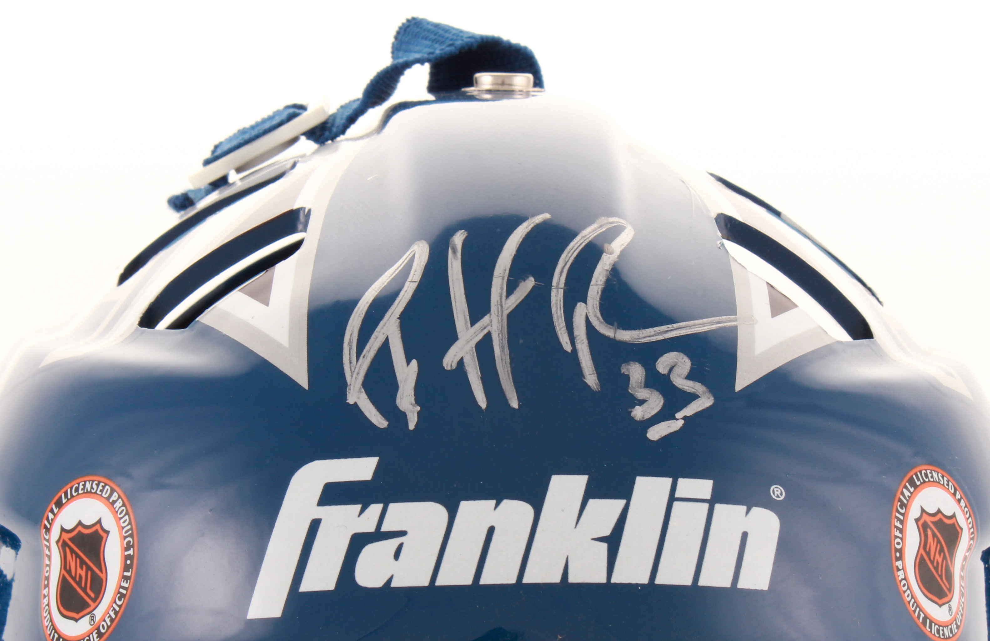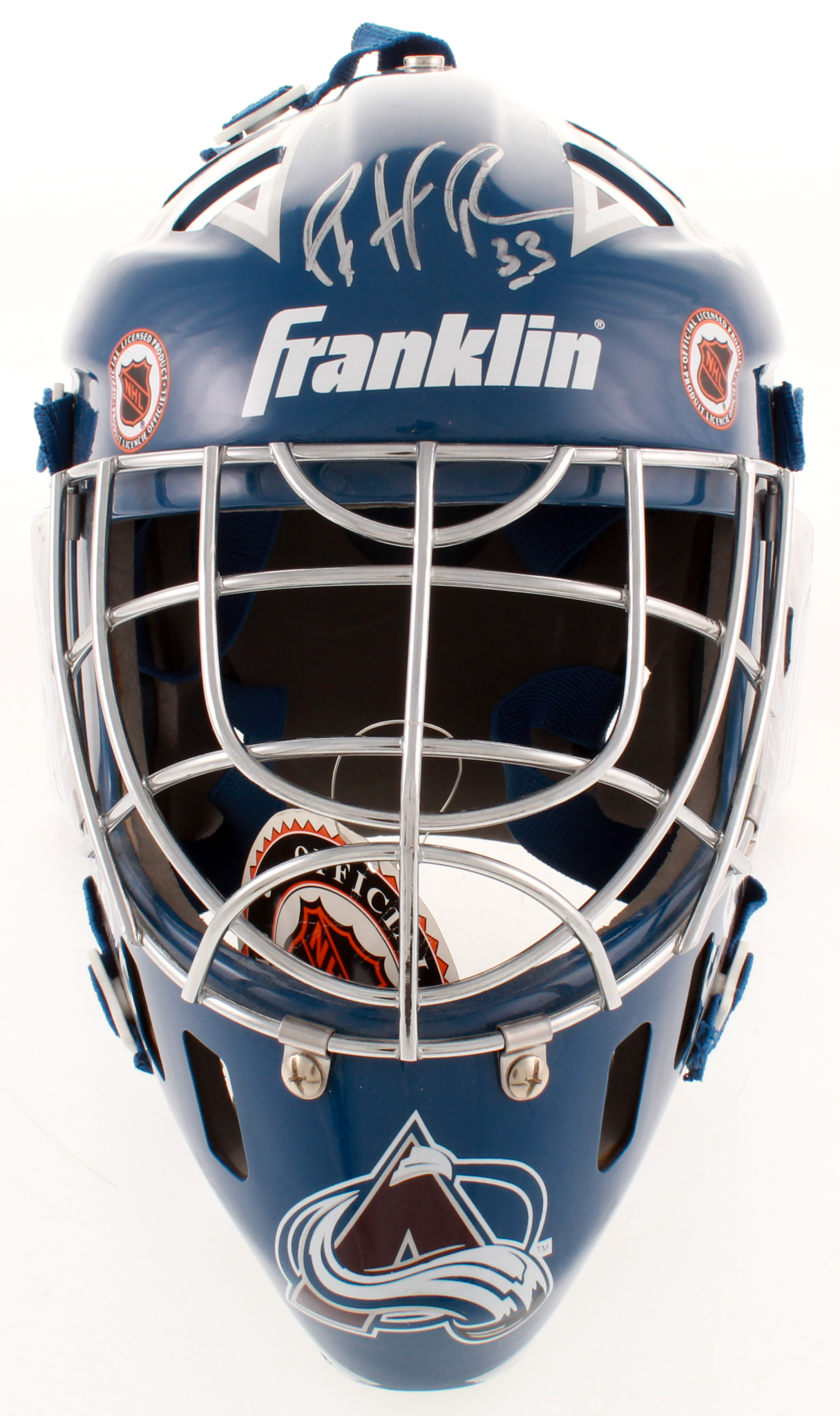Franklin full-size replica Colorado Avalanche goalie mask. Hand-signed in silver paint pen by Patrick Roy (HOF). Please see images for details regarding the condition of the helmet.