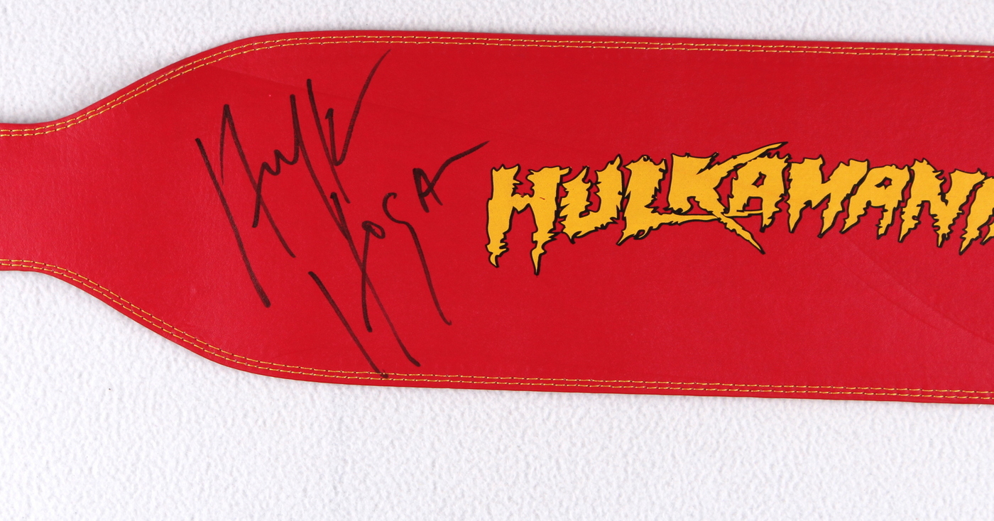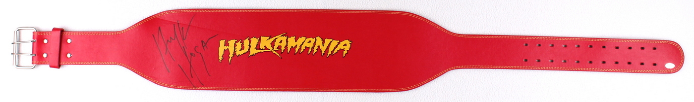Hulkamania belt measures approximately 48" in length and is hand-signed in black felt-tip pen by Hulk Hogan. The autograph includes an official Schwartz Sports Hologram and matching COA for authenticity purposes.