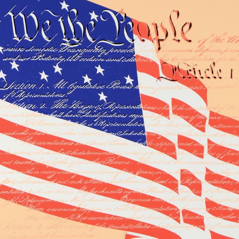 "We the People" is a limited edition silkscreen on canvas by Andy Warhol protege Steve Kaufman (1960-2010). This piece is numbered 8/50 and hand signed inverso. Includes Certificate of Authenticty. Measures approx. 20" x 20" (image). There is a small vertical scuff on the top-right part of the image.