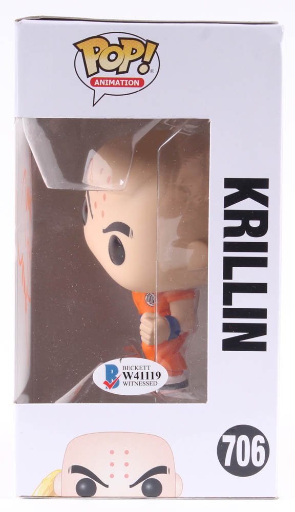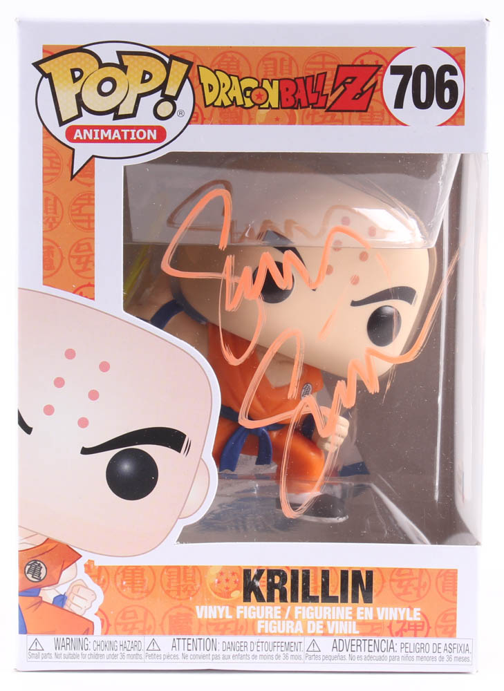 Funko Pop! Vinyl figure measures approximately 4" in height and comes in the original packaging as shown. Has been hand-signed in orange paint pen by Sonny Strait (Krillin).