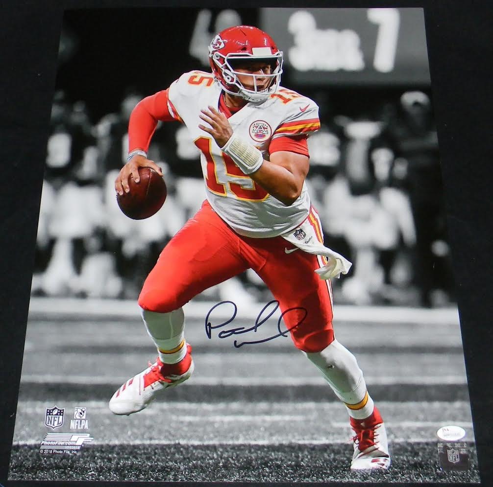 Photo measures 16" x 20" in size and has been hand-signed in black felt tip pen by Patrick Mahomes.