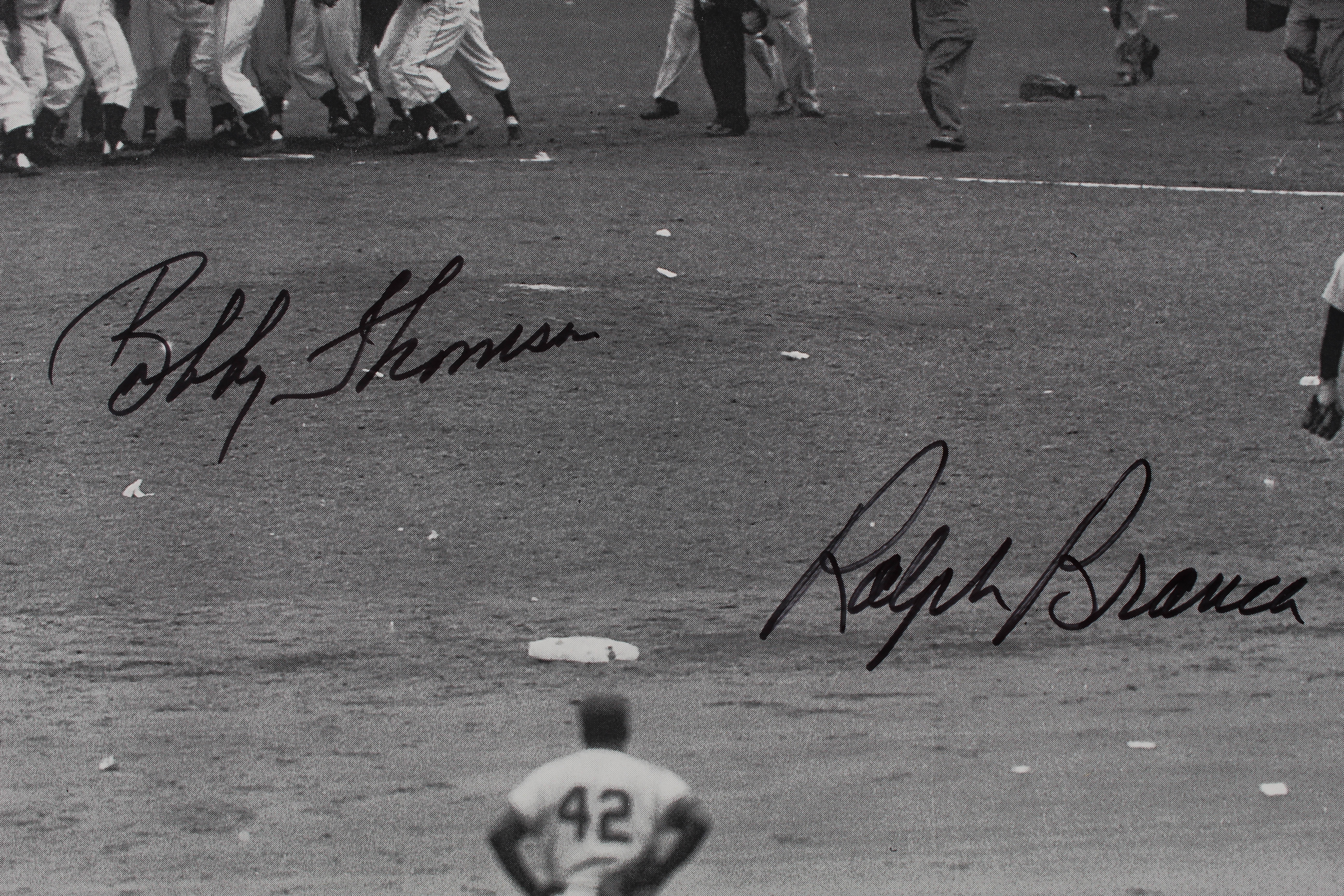 The custom matted photo display measures 11" x 14" in size and features a 8" x 10" photo of the "Shot Heard 'Round the World" and has been hand-signed in black felt-tip pen by Bobby Thompson (D. 2010, New York Giants) and Ralph Branca (D. 2016, Brooklyn Dodgers).