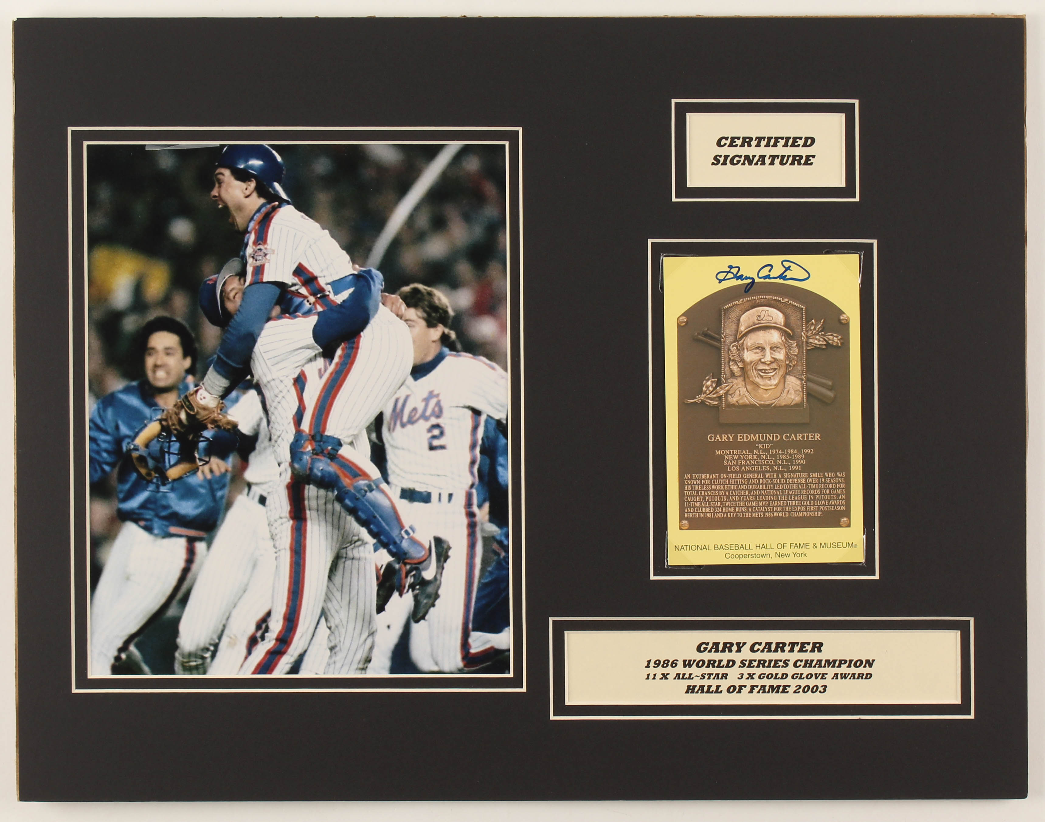 Gary Carter Signed Expos 14x18 Custom Matted Gold Hall of Fame Plaque Postcard Display (JSA COA)