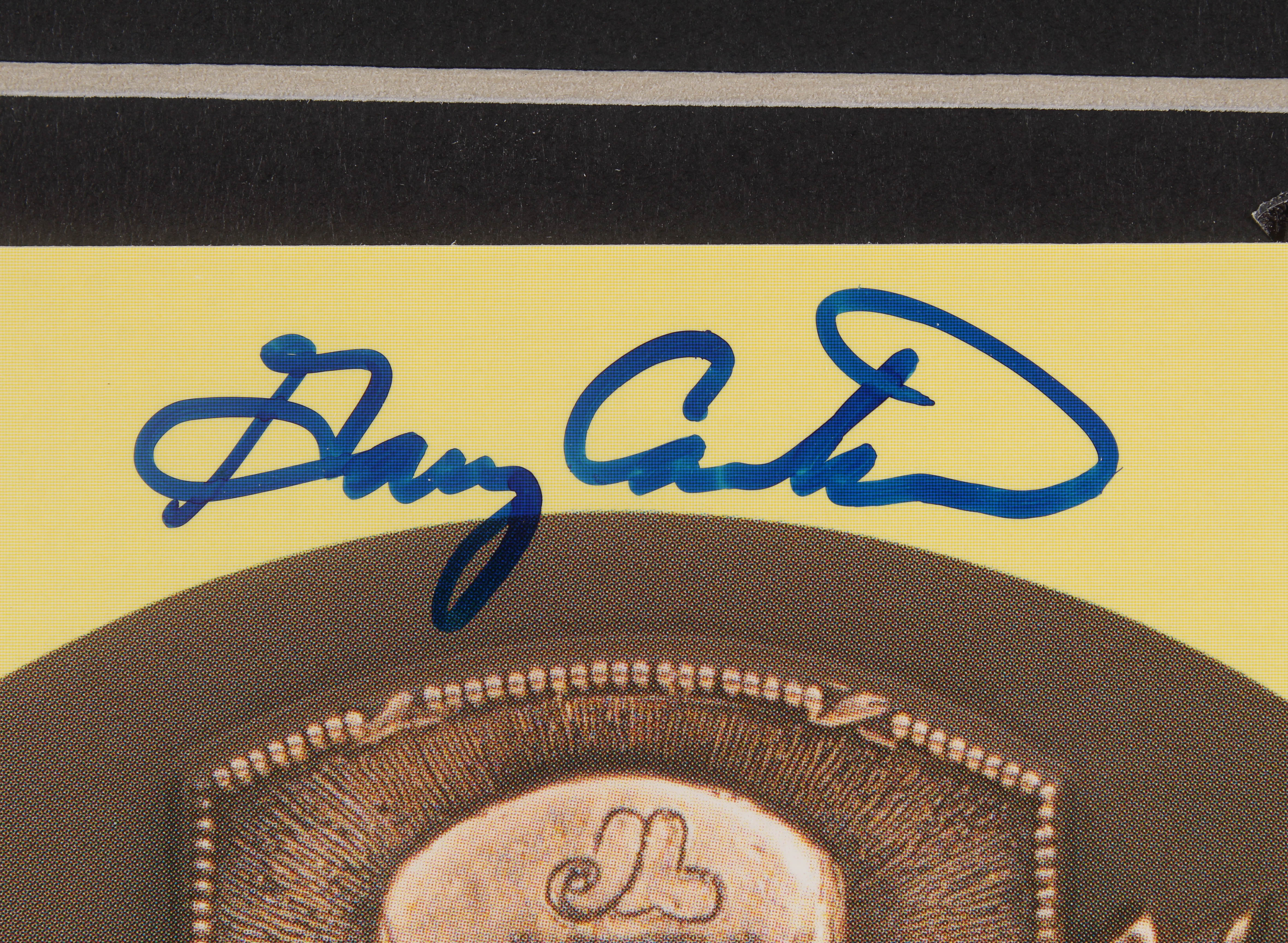 Custom frame measures 14" x 18" in size and features a postcard that measures 3.5" x 5.5" in size and has been hand-signed in blue felt-tip pen by Gary Carter (D. 2012, Montreal Expos, HOF). Also includes a photo of Carter.