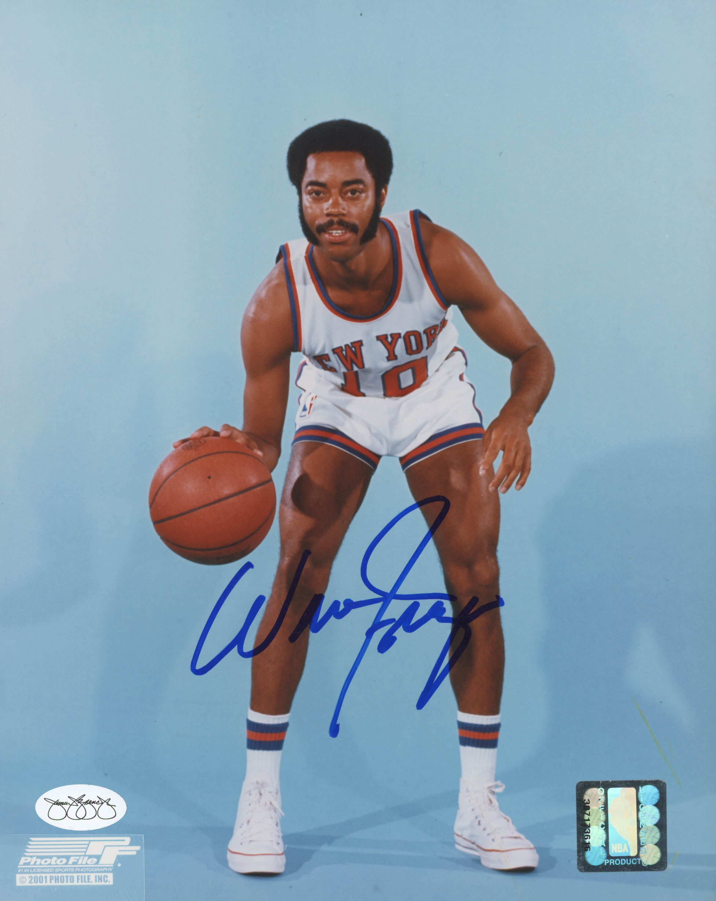 Photo measures 8" x 10" in size and has been hand-signed in blue felt-tip pen by Walt Frazier (New York Knicks, HOF).