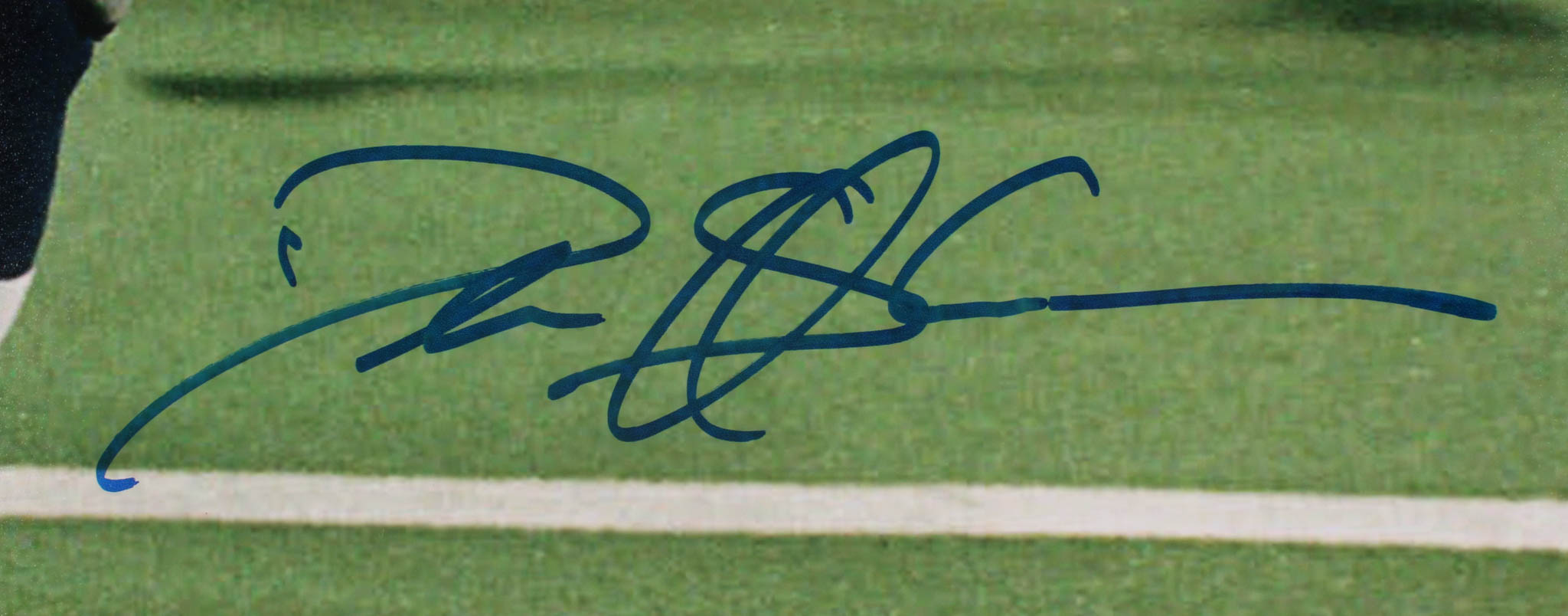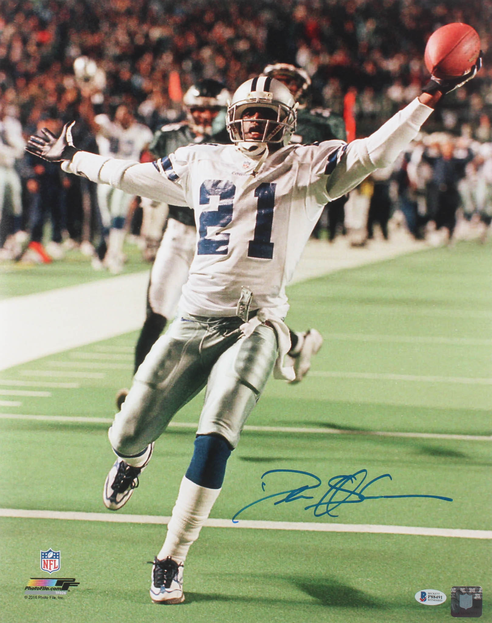 Photo measures 16" x 20" in size and has been hand-signed in blue felt-tip pen by Deion Sanders (Dallas Cowboys, HOF).