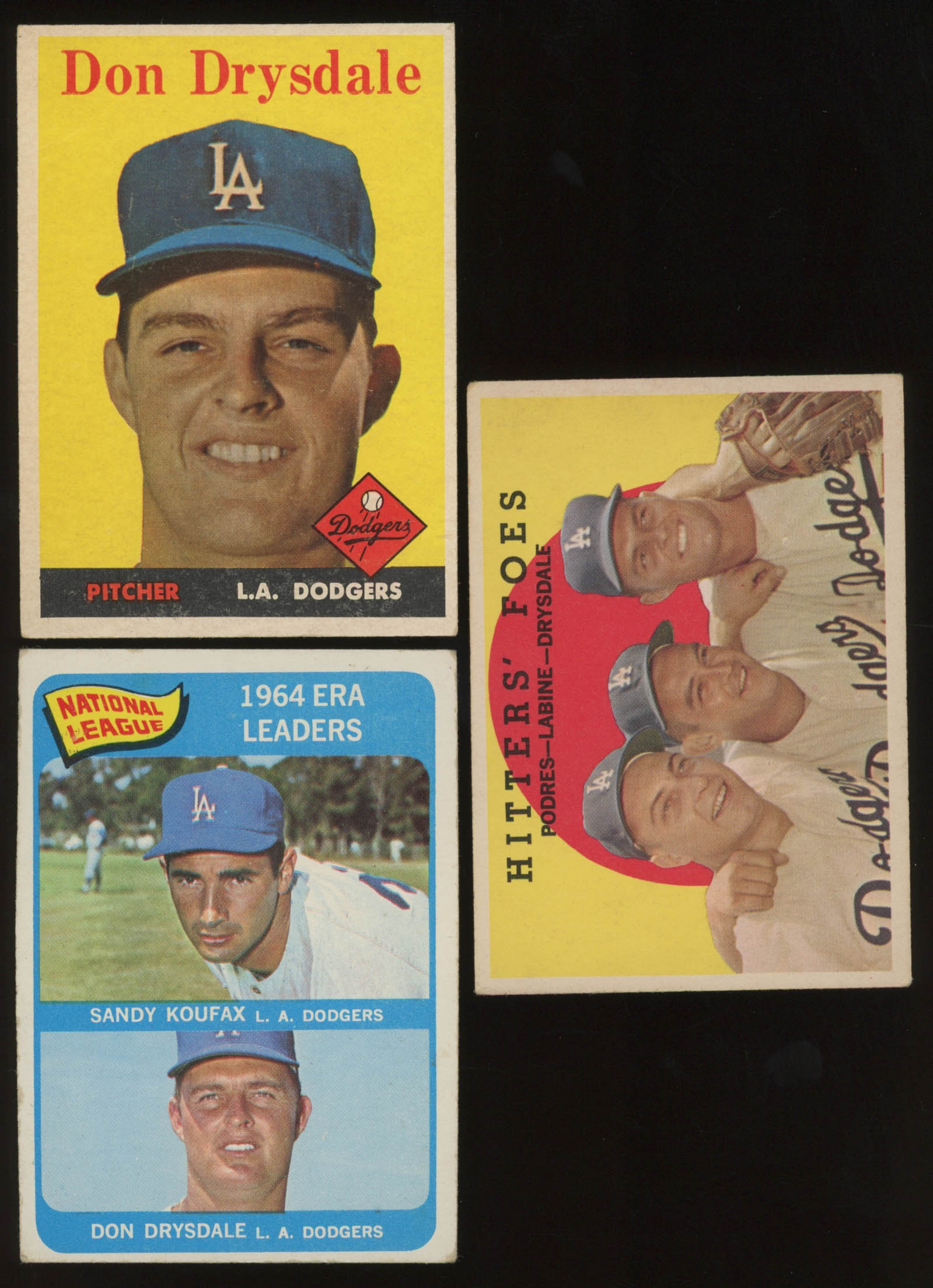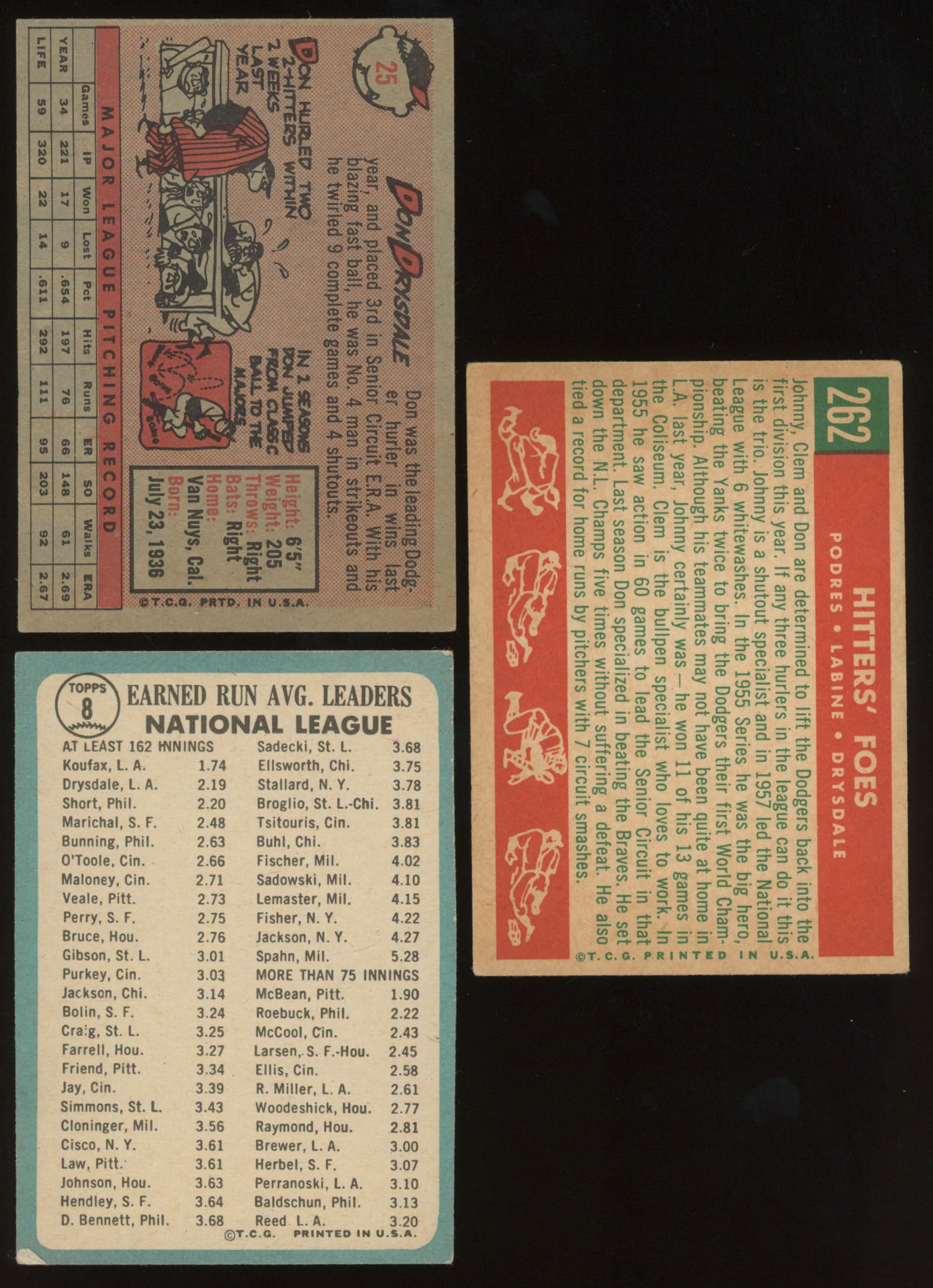 Lot of (3) Don Drysdale Baseball Cards with 1958 Topps #25, 1959 Topps #262 Hitters Foes / Johnny Podres / Clem Labine / Don Drysdale, & 1965 Topps #8 NL ERA Leaders / Sandy Koufax / Don Drysdale