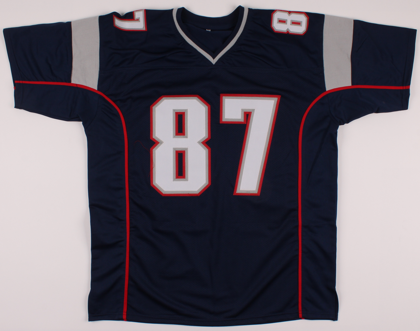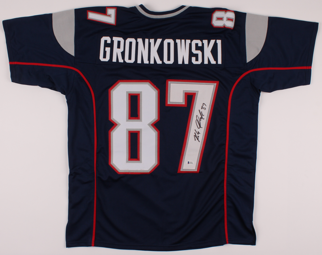 Custom on-field style jersey. Everything sewn on, size XL. Hand-signed in black felt-tip pen by Rob Gronkowski.