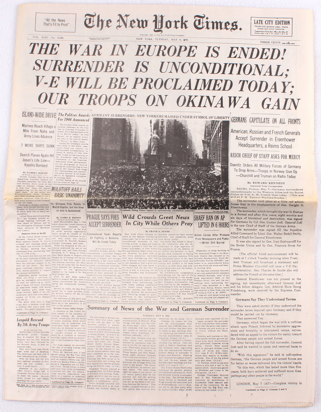 "The New York Times" Original Vintage 1945 Newspaper with Headline: "The War in Europe is Ended! Surrender is Unconditional; V-E Will be Proclaimed Today; Our Troops on Okinawa Gain"