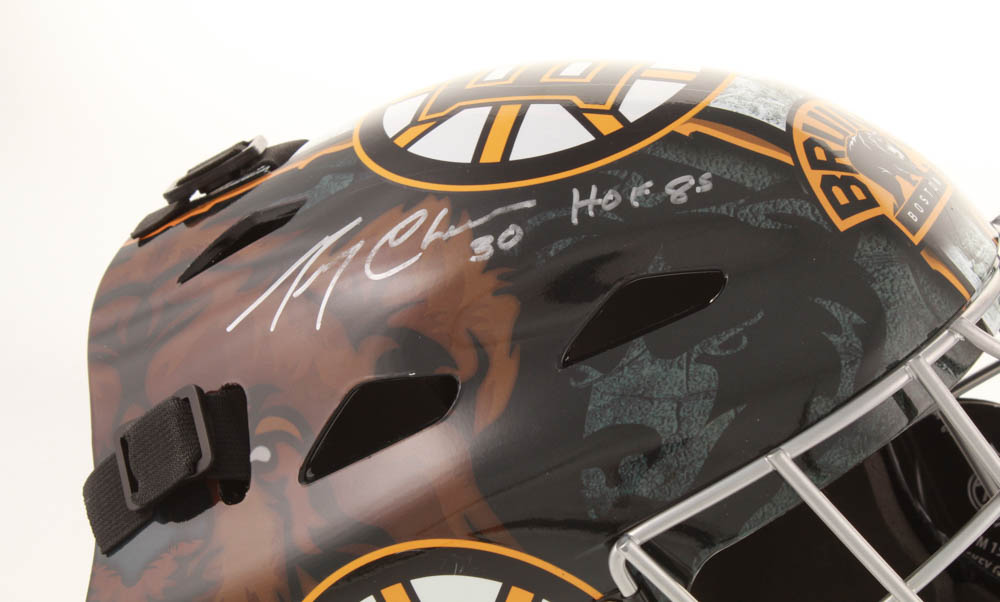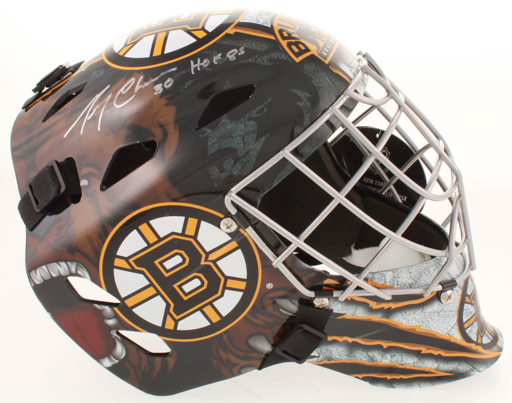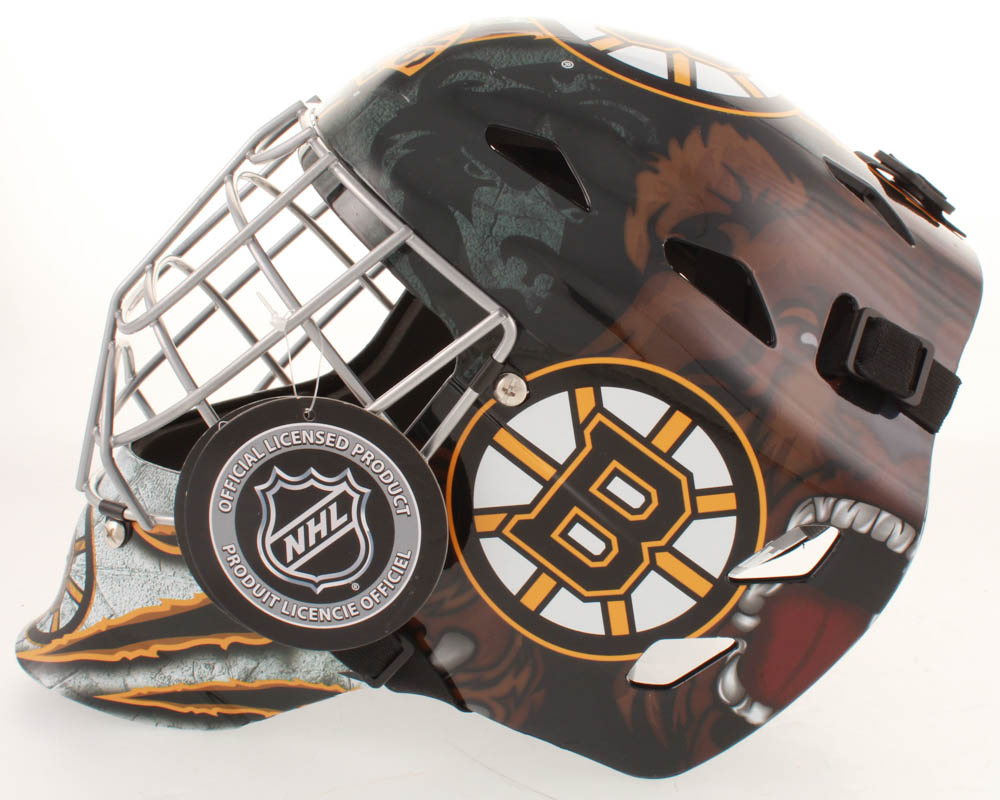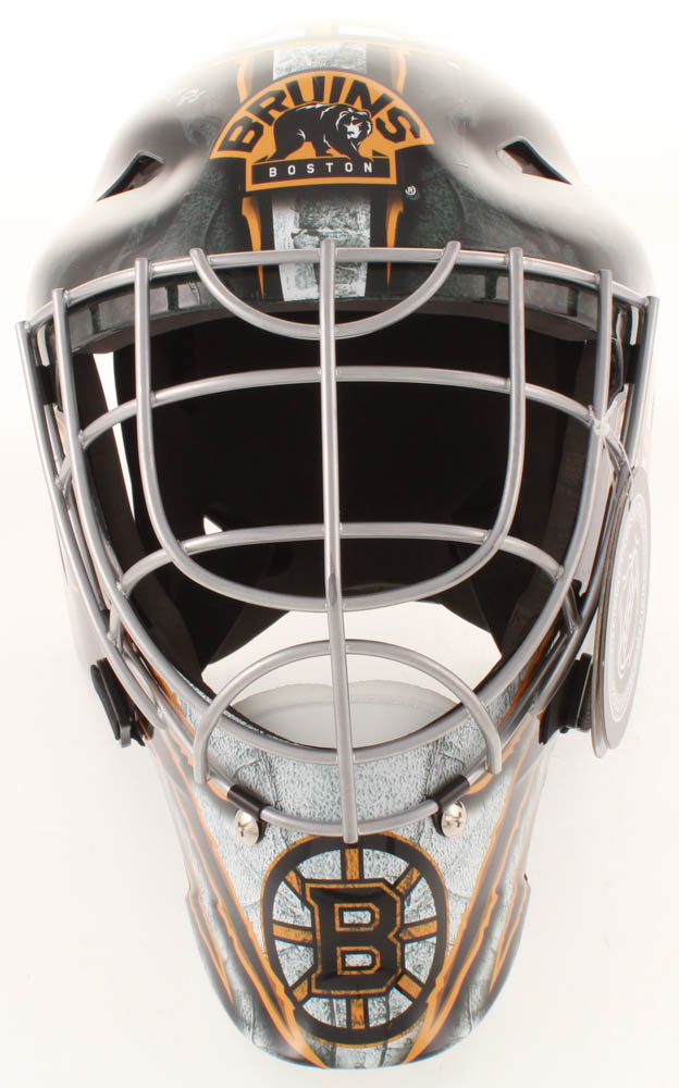 Franklin NHL Boston Bruins full-size replica hockey goalie mask. Hand-signed in silver paint pen by Gerry Cheevers (Boston Bruins, HOF).