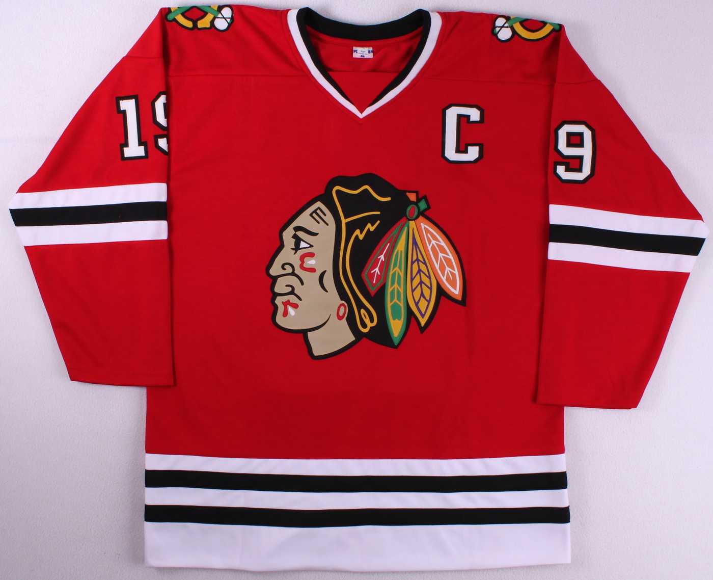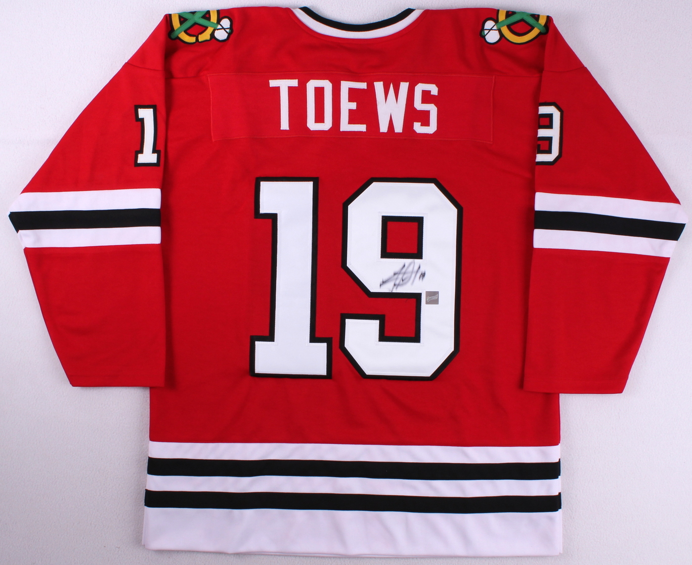 Custom on-ice style jersey. Everything sewn on, size XL. Hand-signed in black felt-tip pen by Jonathan Toews. Please note, the autograph has bled. The autograph includes an official Frameworth hologram and matching COA for authenticity purposes.