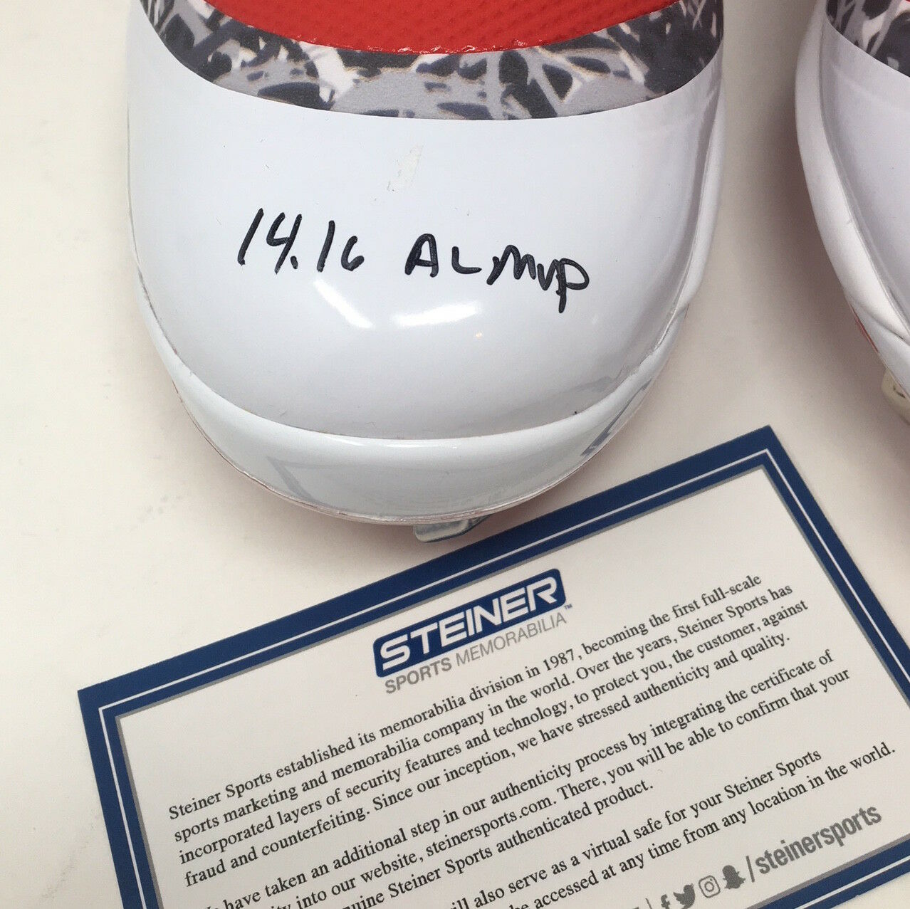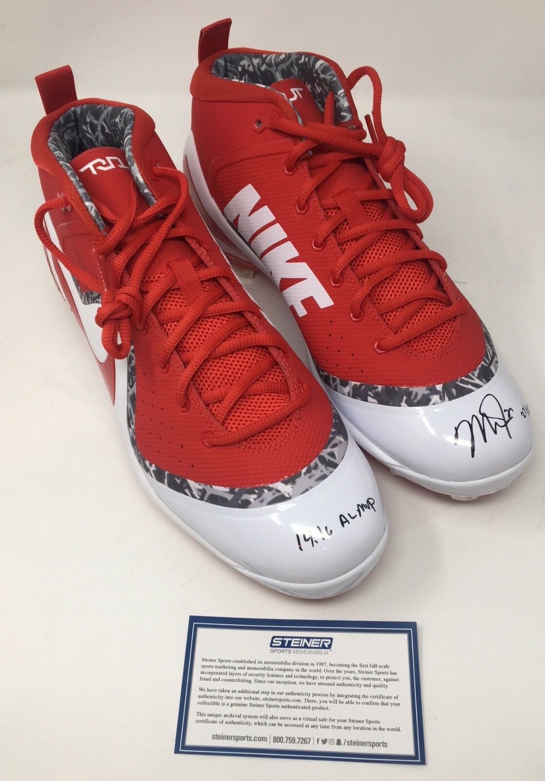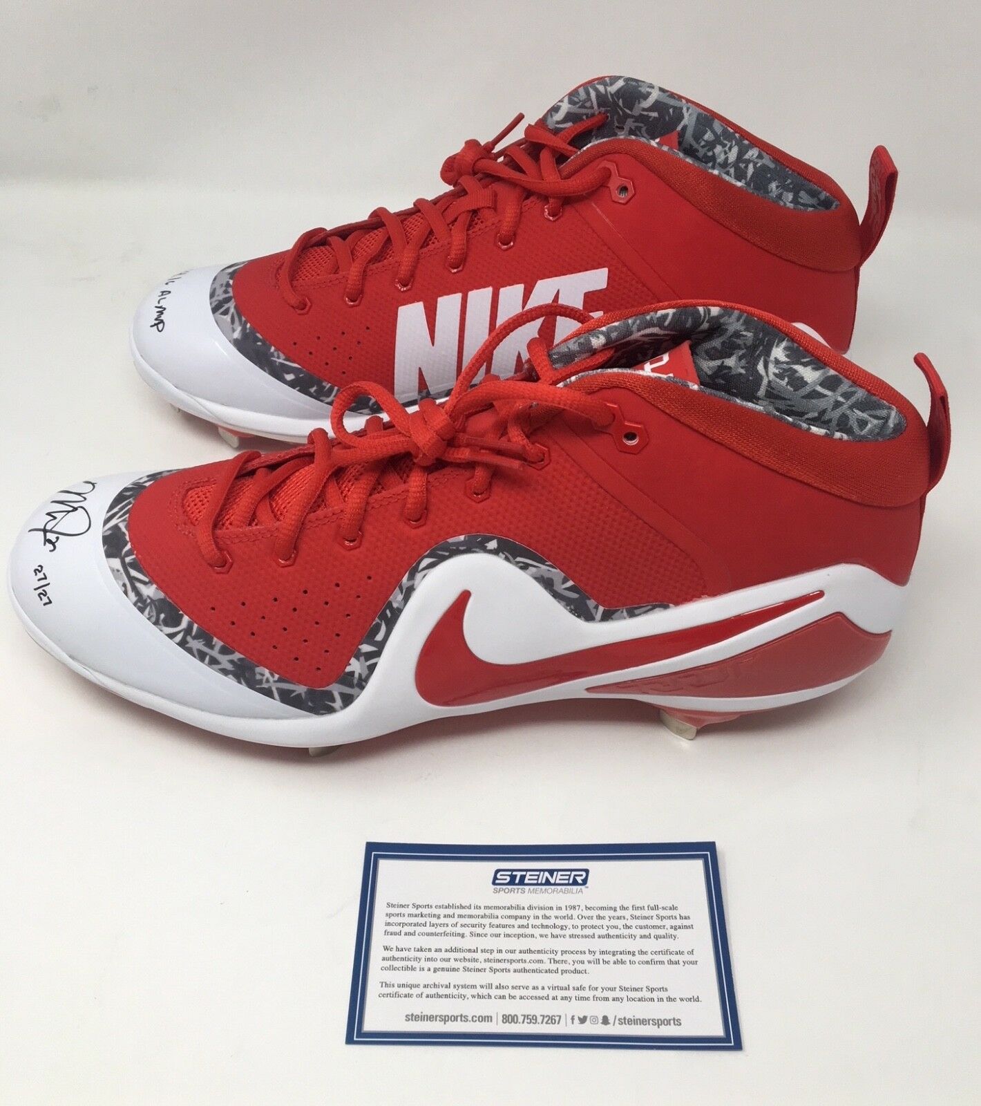 These Nike Force Zoom Trout 4 Cleats have been hand signed and inscribed by Mike Trout. Trout added the inscription "14/16 AL MVP" to make this limited edition item a must have for any collector. The signature on this item has been authenticated by Major League Baseball and features a uniquely numbered tamper proof hologram which can be verified in the Major League Baseball online database. This process ensures your item is authentic and prevents duplication and fraud. In addition, a Steiner Sports hologram and certificate is included. This helmet is limited to only 27 and you will receive number "27" from that edition. 100% Guaranteed Authentic. Features Tamper-Evident Steiner Hologram. Perfect Collector's Item.