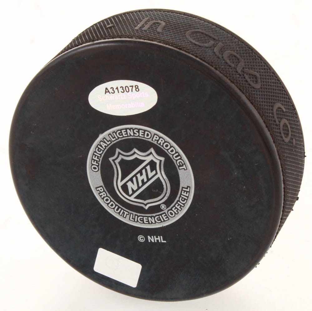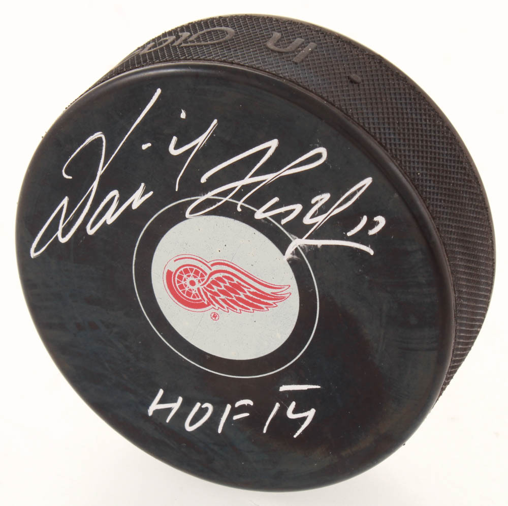 NHL Detroit Red Wings logo hockey puck. Has been hand-signed and inscribed by Dominik Hasek. (HOF)