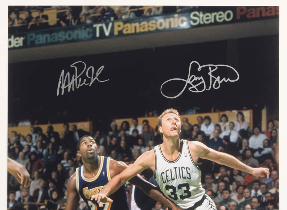 Photo measures 16" x 20" in size and has been hand-signed in silver paint pen by Magic Johnson (Los Angeles Lakers, HOF) and Larry Bird (Boston Celtics, HOF).