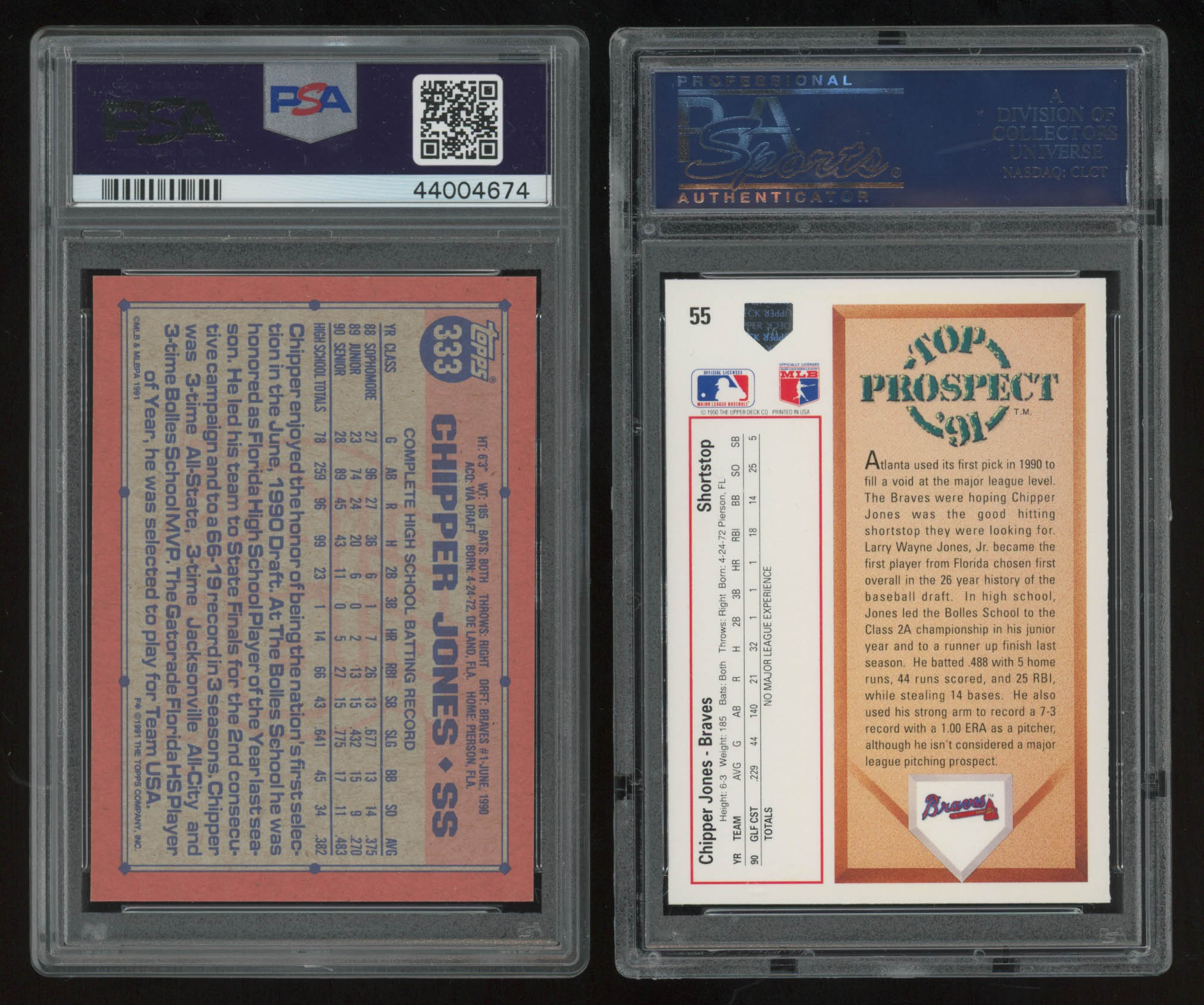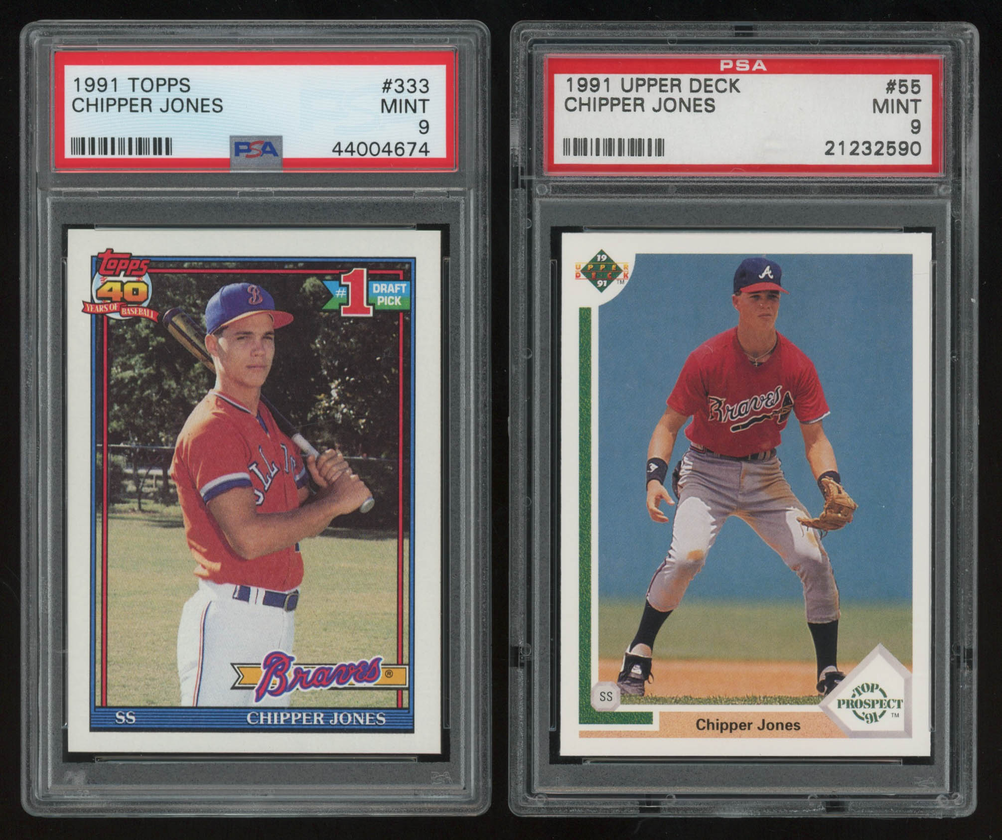 Lot of (2) PSA Graded 9 Chipper Jones Baseball Cards with 1991 Upper Deck #55 RC & 1991 Topps #333 RC