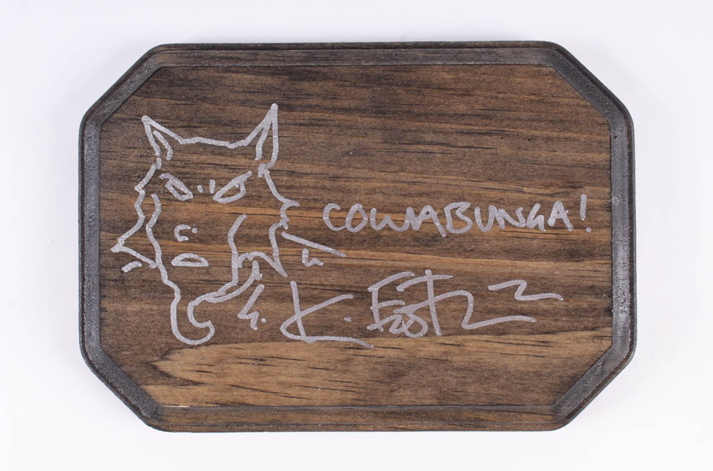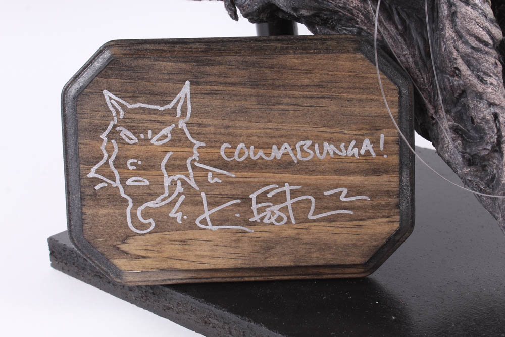 This original one-of-a-kind foam-filled latex sculpture was created by the extremely talented artist, Tate Steinsiek of Ill Willed Productions. It measures approximately 12" x 18" x 16" in size (L x W x H). The piece includes an adjustable wooden plaque with a sketch hand-drawn by the co-creator of the Teenage Mutant Ninja Turtles, Kevin Eastman. The plaque is also hand-signed by Eastman.