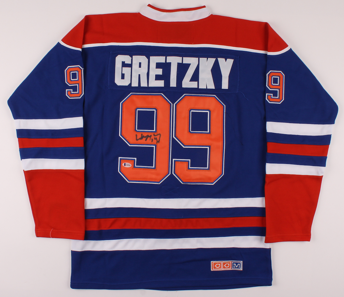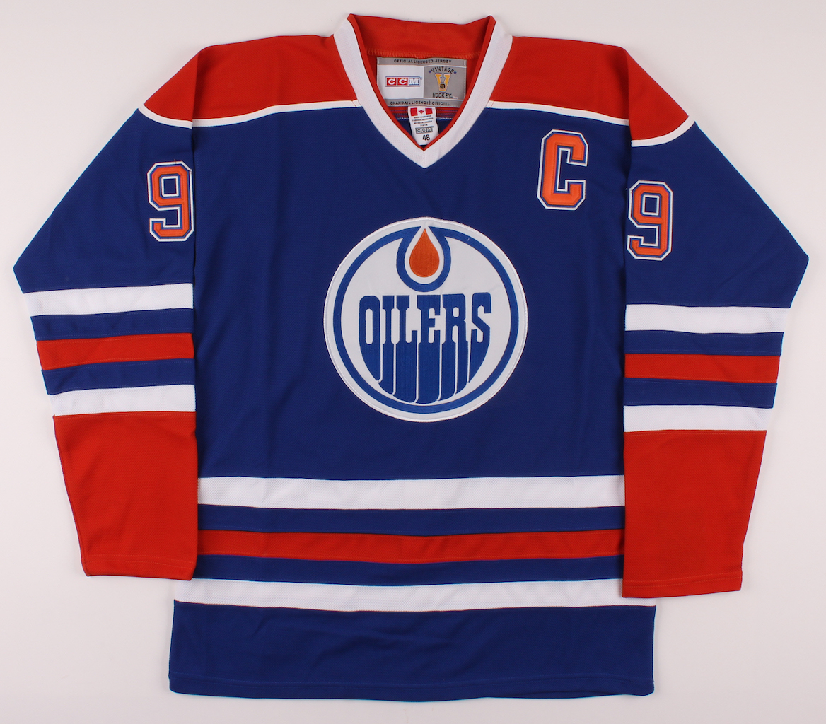 CCM on-ice style captain's jersey. Everything is sewn on, size 48. Hand-signed in black felt-tip pen by Wayne Gretzky (Edmonton Oilers, HOF).