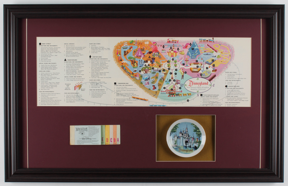 1959 Disneyland 18.5x29 Custom Framed 1959 Vintage Map Display with Ticket Booklet & Vintage Souvenir Dish