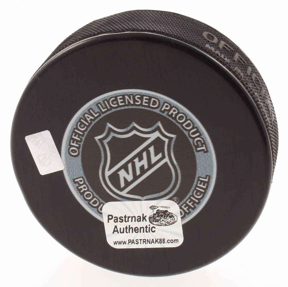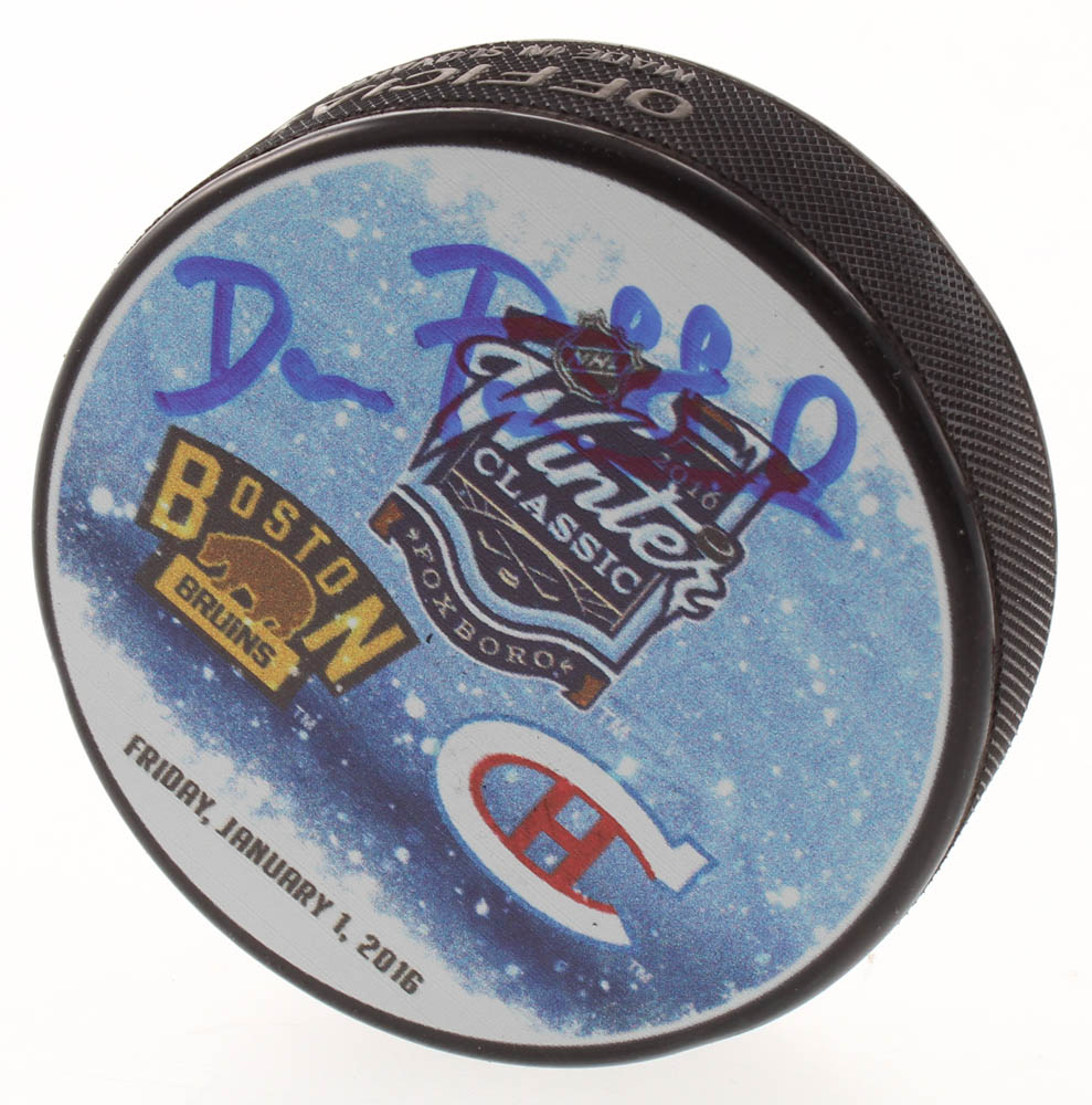 2016 Winter Classic Logo Hockey Puck. Hand-signed in blue felt-tip pen by David Pastrnak. (Boston Bruins)