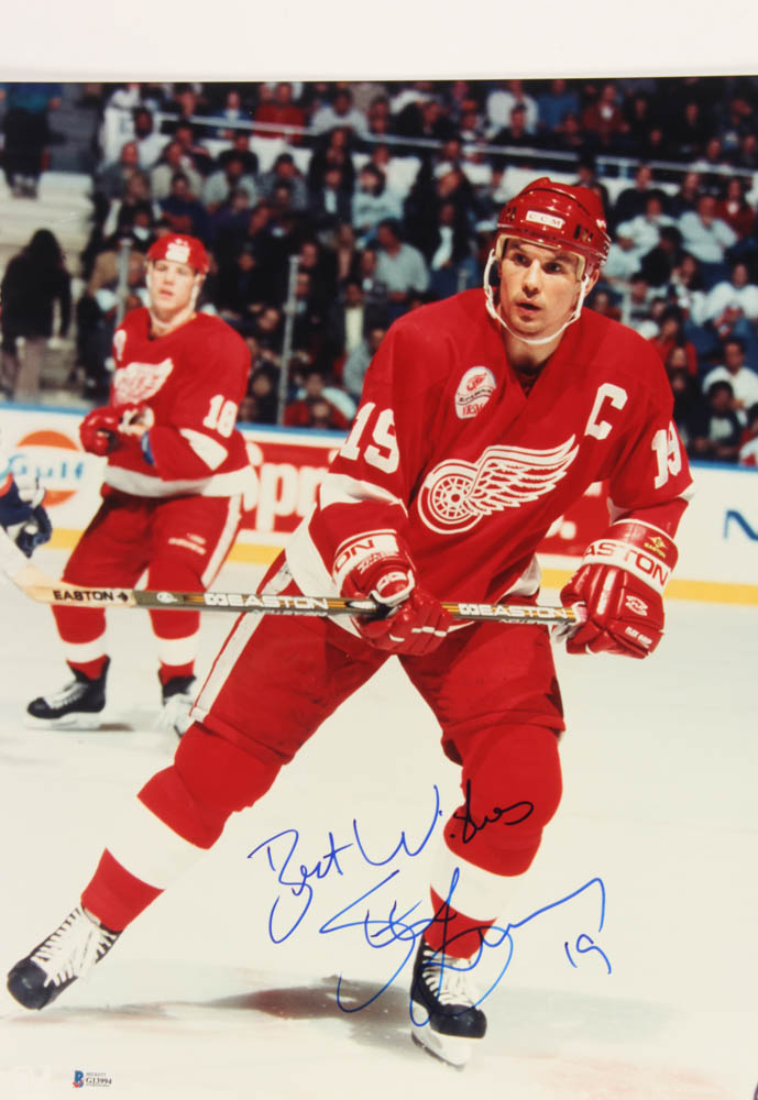 Photo measures 16" x 20" in size and has been hand-signed in blue felt-tip pen by Steve Yzerman (Detroit Red Wings, HOF).