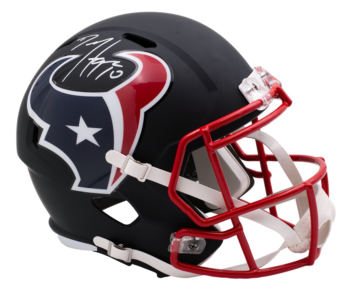 Riddell Houston Texans full-size replica matte black speed helmet. Hand-signed in white paint pen by DeAndre Hopkins.