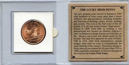 Lucky Irish penny: The scarce, pre-1969, large (half-dollar-size) penny shows classic harp and hen-and chicks motifs. In brilliant uncirculated condition it is an enduring source of good luck.