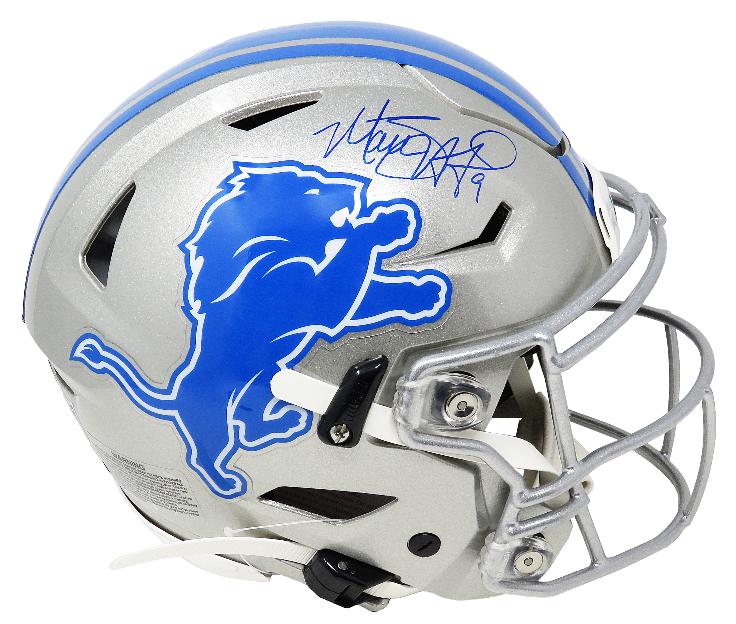 Riddell Detroit Lions full-size authentic on-field speedflex helmet. Hand-signed in blue felt tip pen by Matthew Stafford.