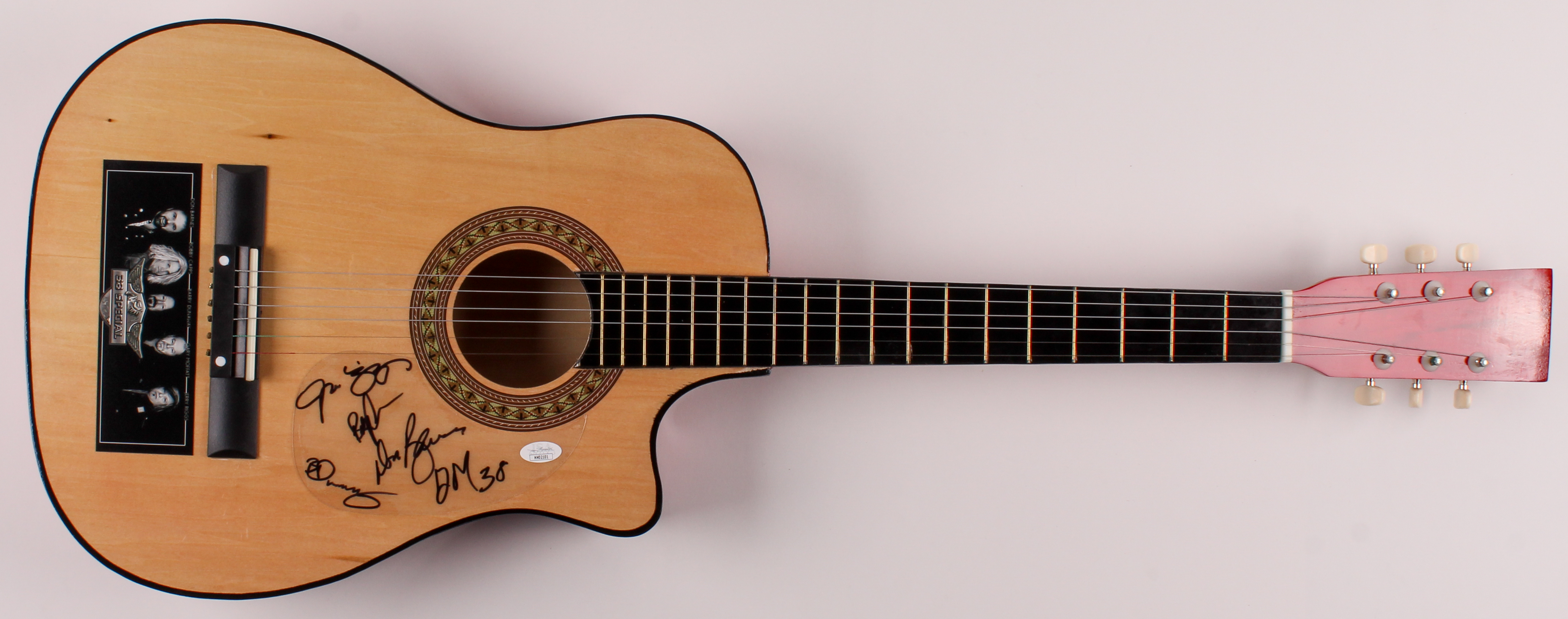 Acoustic guitar measures approximately 38" in length and has been hand-signed in black felt-tip pen by (5) members of 38 Special with Don Barnes, Bobby Capps, Gary "Madman" Moffatt, Barry Dunaway, and Jerry Riggs.