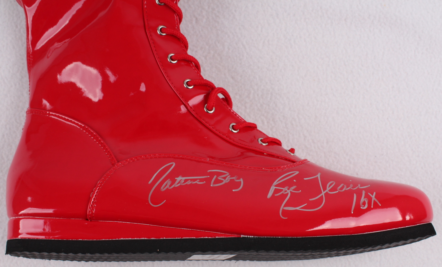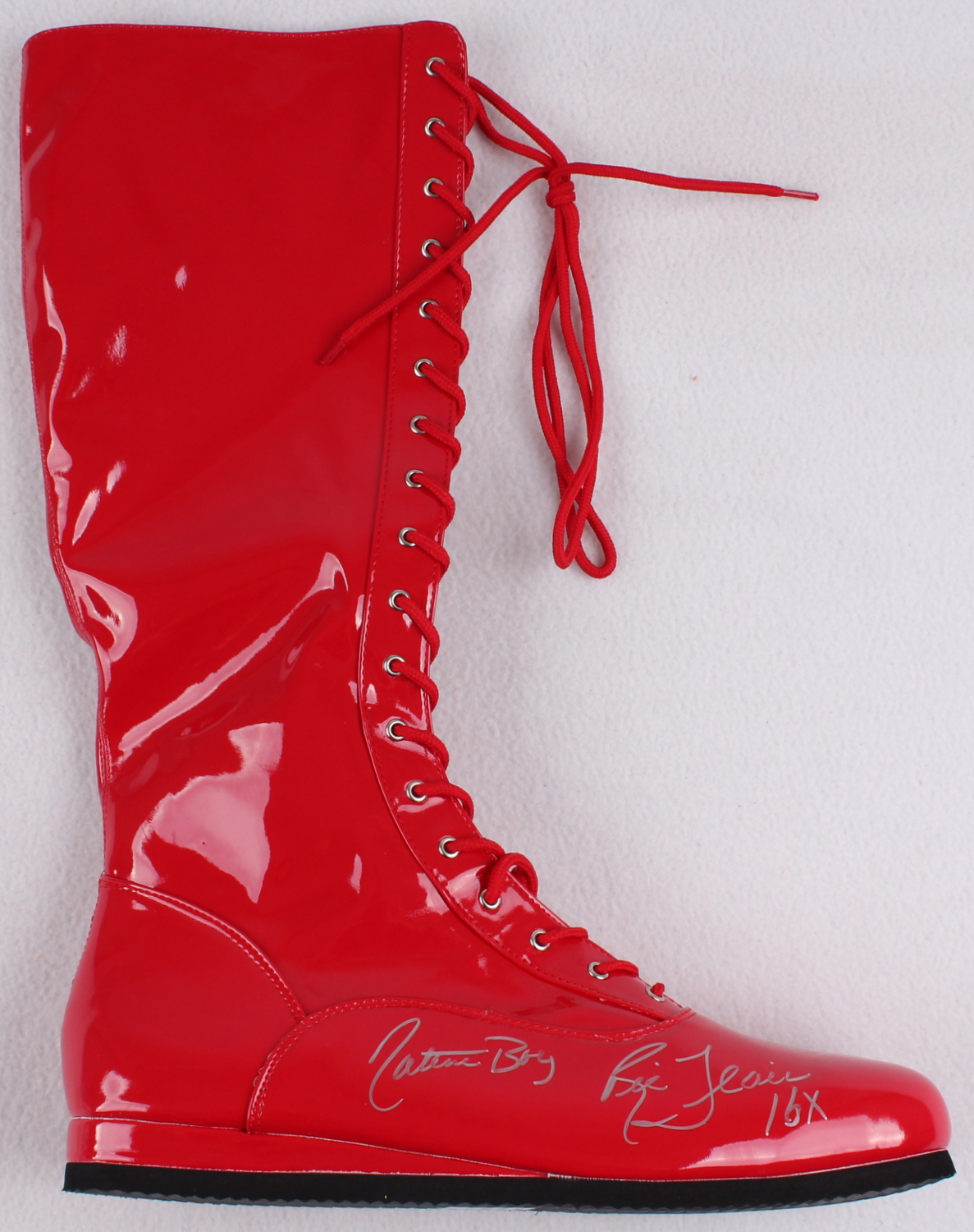 Wrestling boot hand-signed and inscribed in silver paint pen by Ric Flair. The autograph includes an official Schwartz Sports Hologram and matching COA for authenticity purposes.