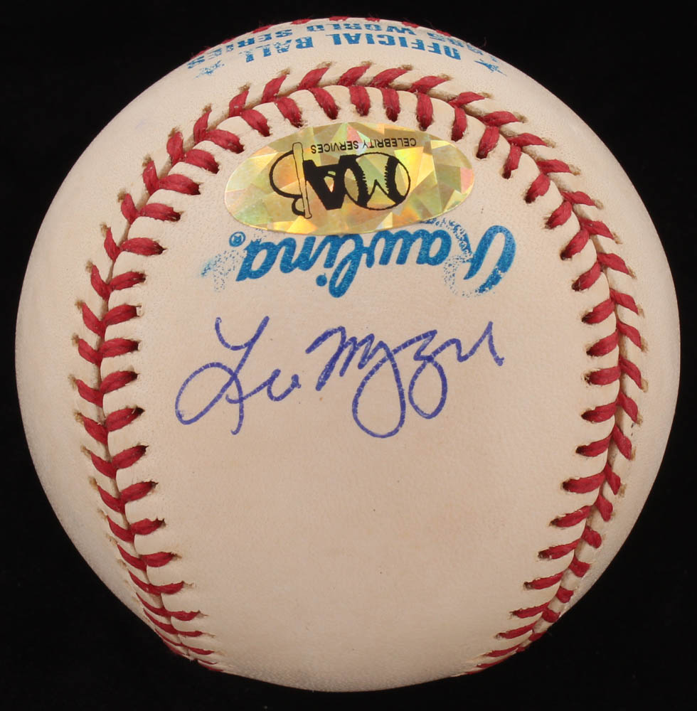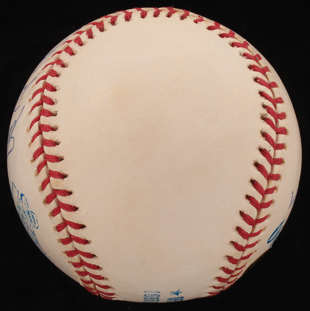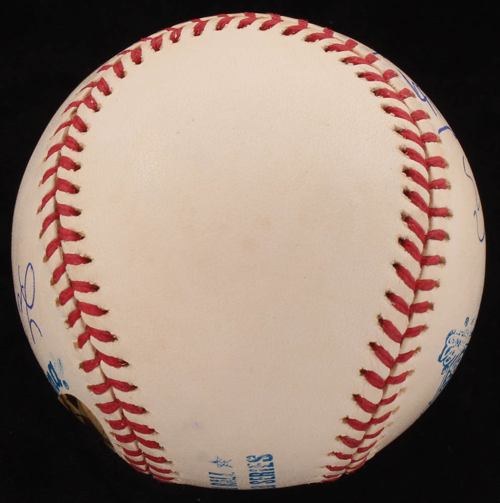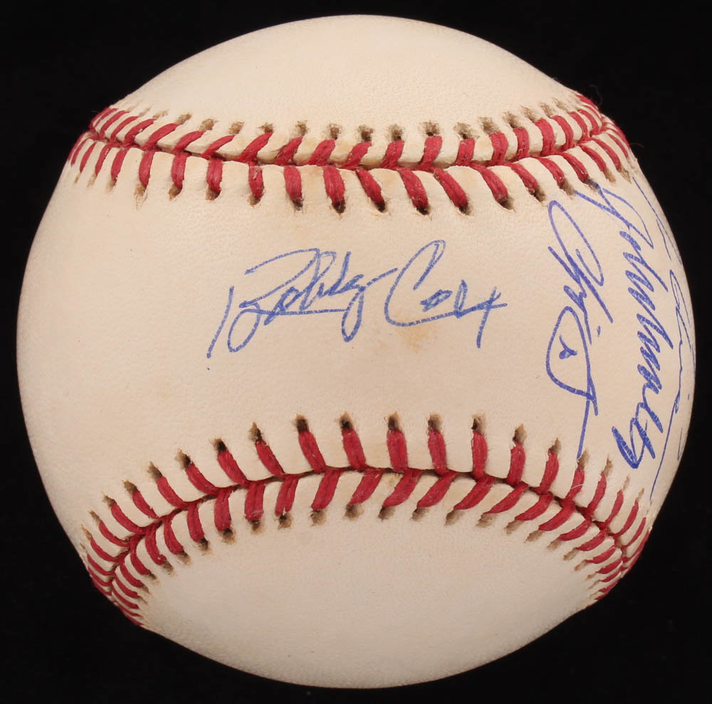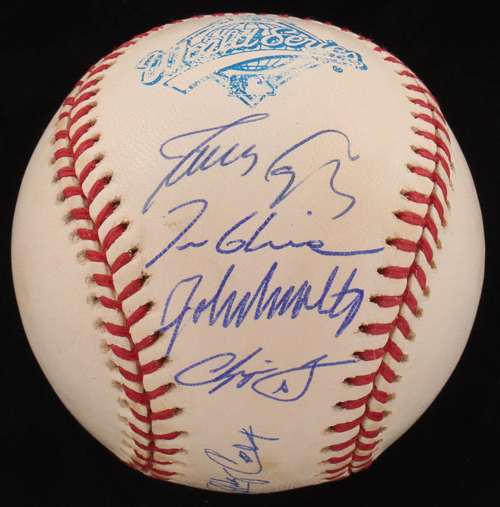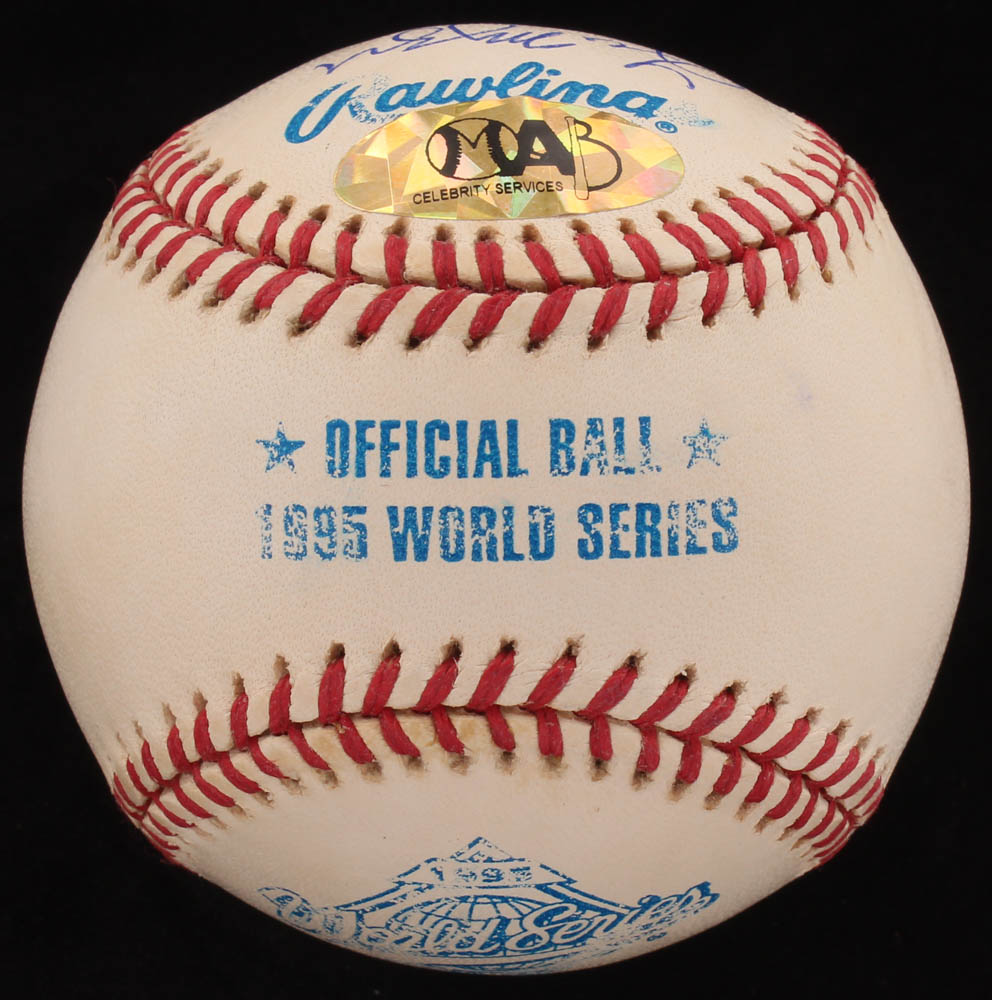 Rawlings Official 1995 World Series Logo Baseball has been hand-signed in blue ink pen by (6) of the 1995 World Series-winning Atlanta Braves, with Tom Glavine (HOF), Chipper Jones (HOF), Bobby Cox (HOF), John Smoltz (HOF), Leo Mazzone, and Javy Lopez. Please see images for details regarding the condition of the ball.