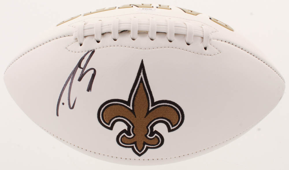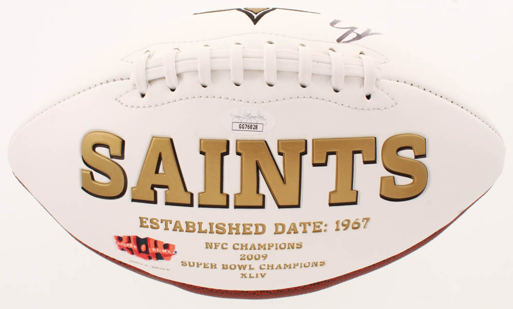 New Orleans Saints Logo Football. Hand-signed in black felt-tip pen by Drew Brees. Please see photos for details regarding the condition of the football.