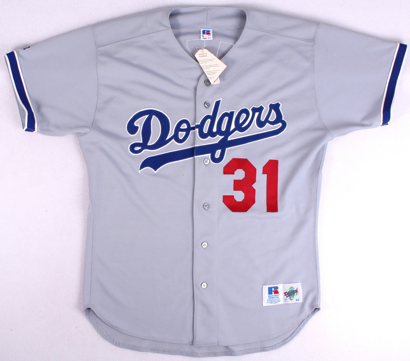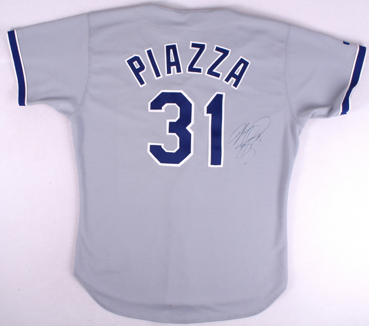 Russell on-field style jersey. Everything is sewn on, size 48. Hand-signed in blue felt tip pen by Mike Piazza (12x All-Star, Dodgers, Marlins, Mets, Padres, Athletics). The autograph include a James Spence Authentication (JSA) Auction House LOA for authenticity purposes.