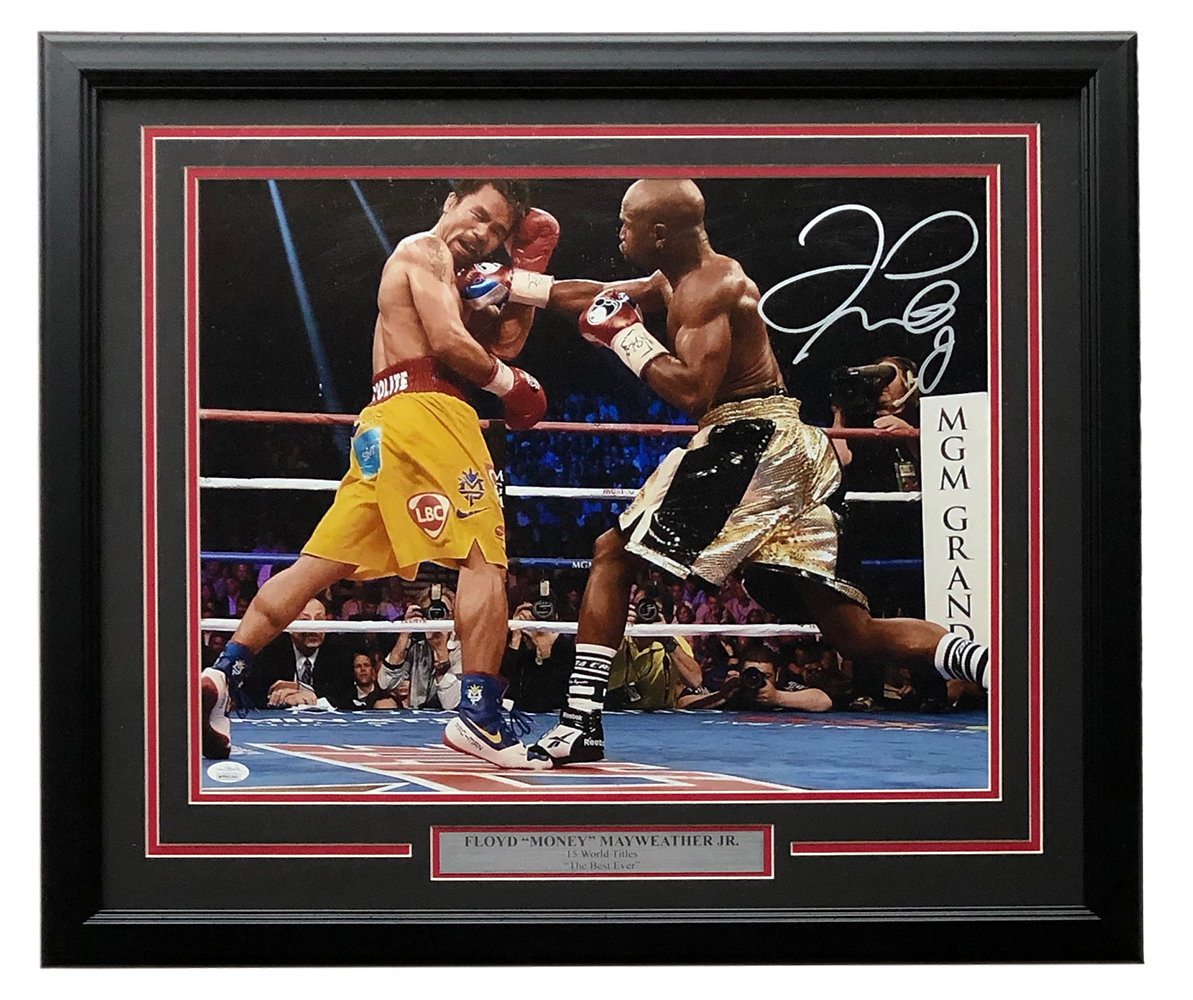 Custom framed display measures approximately 22" x 27" in size and has been hand-signed in silver paint pen by Floyd Mayweather Jr. The display features a photo from Mayweather's fight against Manny Pacquiao.