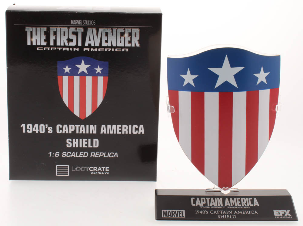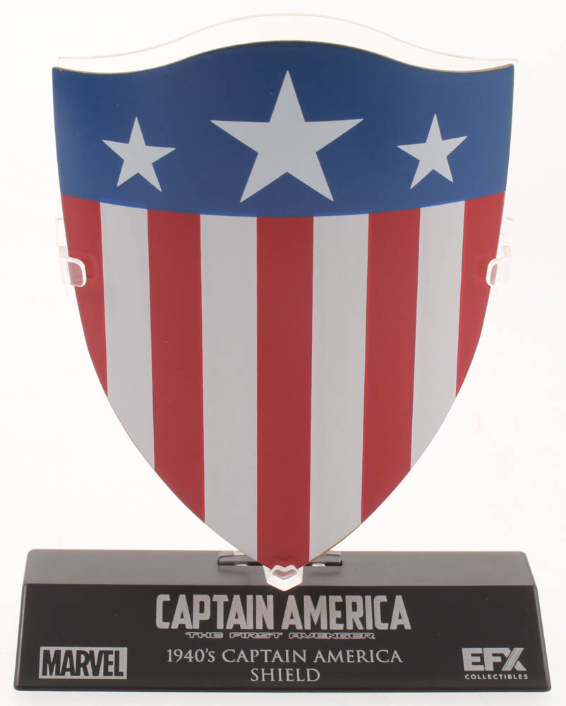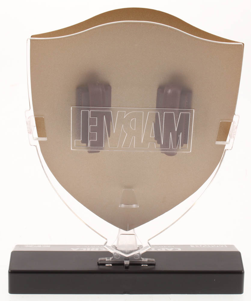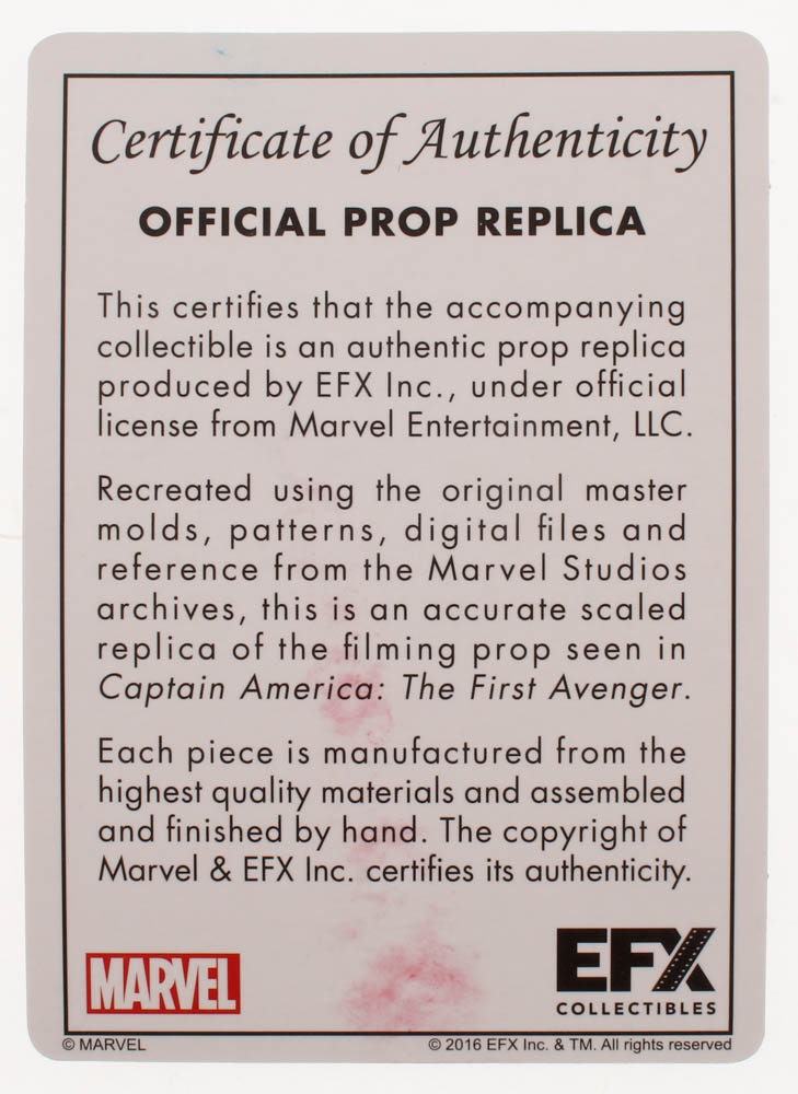 Captain America: The First Avenger movie prop replica. The prop is made of metal and measures 4.5" in height. Includes original packaging and display base as shown above. See the photos for more details regarding the condition of the prop.