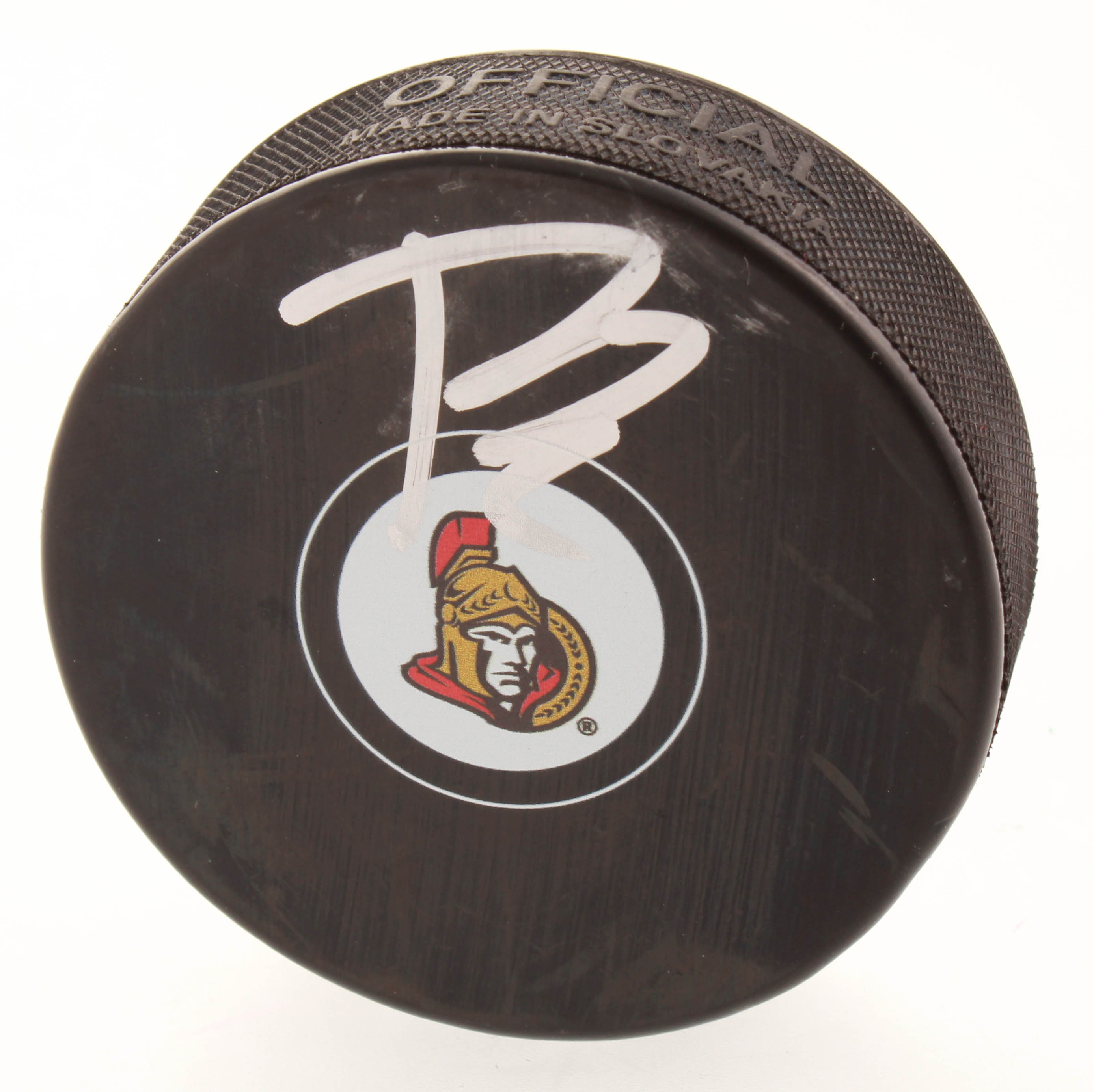 Ottawa Senators logo hockey puck. Hand-signed in silver paint pen by Brady Tkachuk. Please see images for details regarding the condition of the puck.