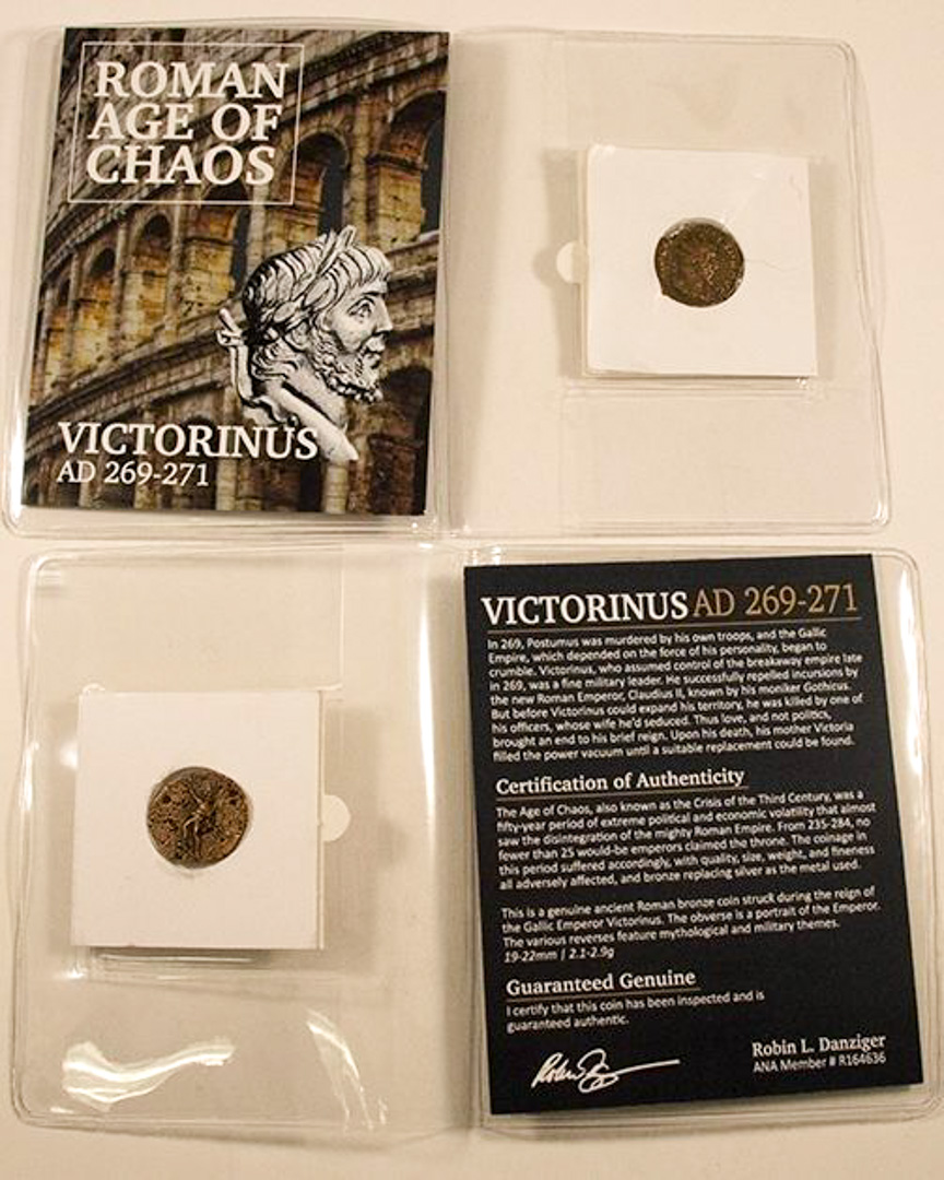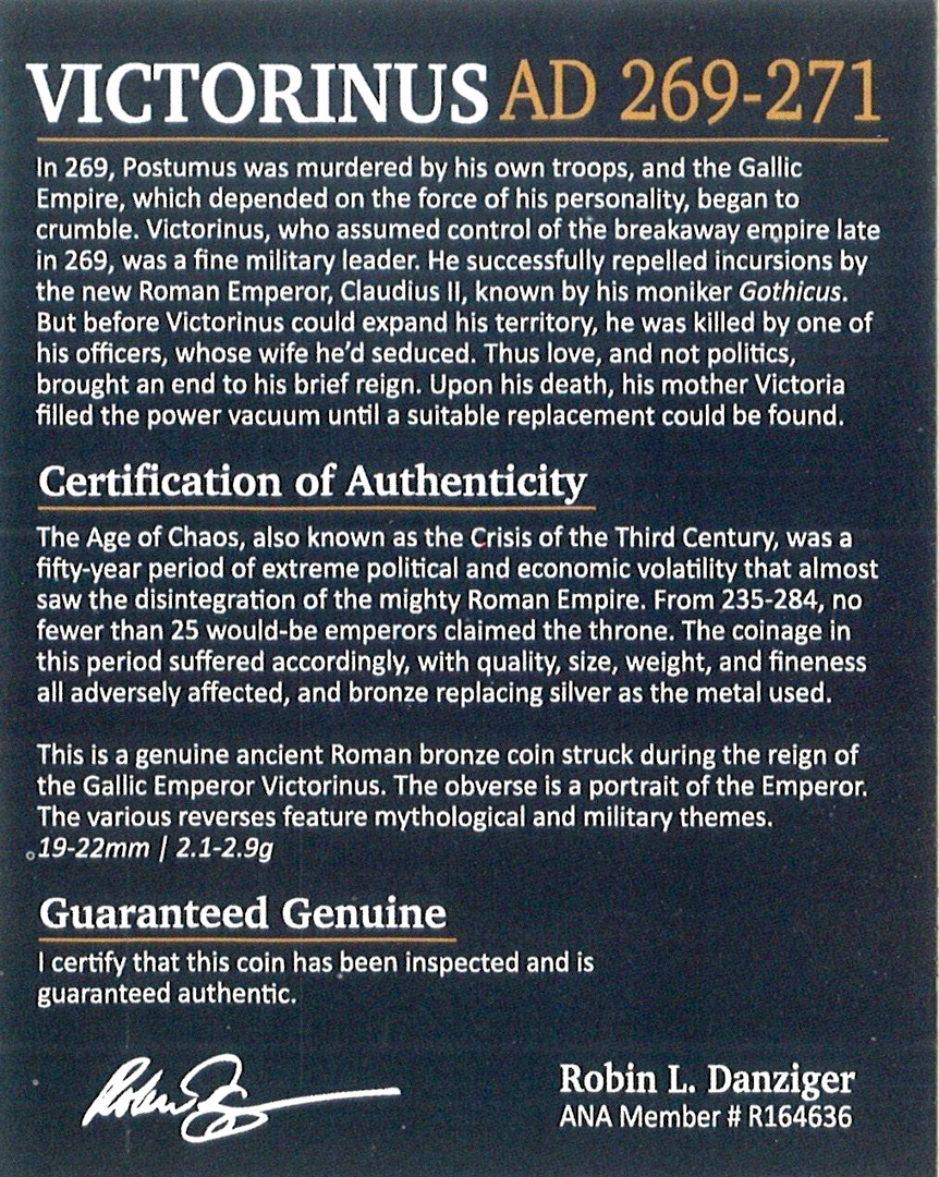 Victorinus was the third emperor of the rebel Gallic-Empire that briefly took control of Britain, Gaul and Spain. He was an able soldier who rose to power under Postumus, the regimes founder. Implicated in the death of its second emperor, Marius, he assumed the purple on his elimination. Victorinus was murdered by an Attitianus, one of his officers, whose wife Victorinus had supposedly seduced. Since the motive was personal and not political, Victorinus' mother, Victoria, was able to continue to hold power after his death and arranged for his deification.