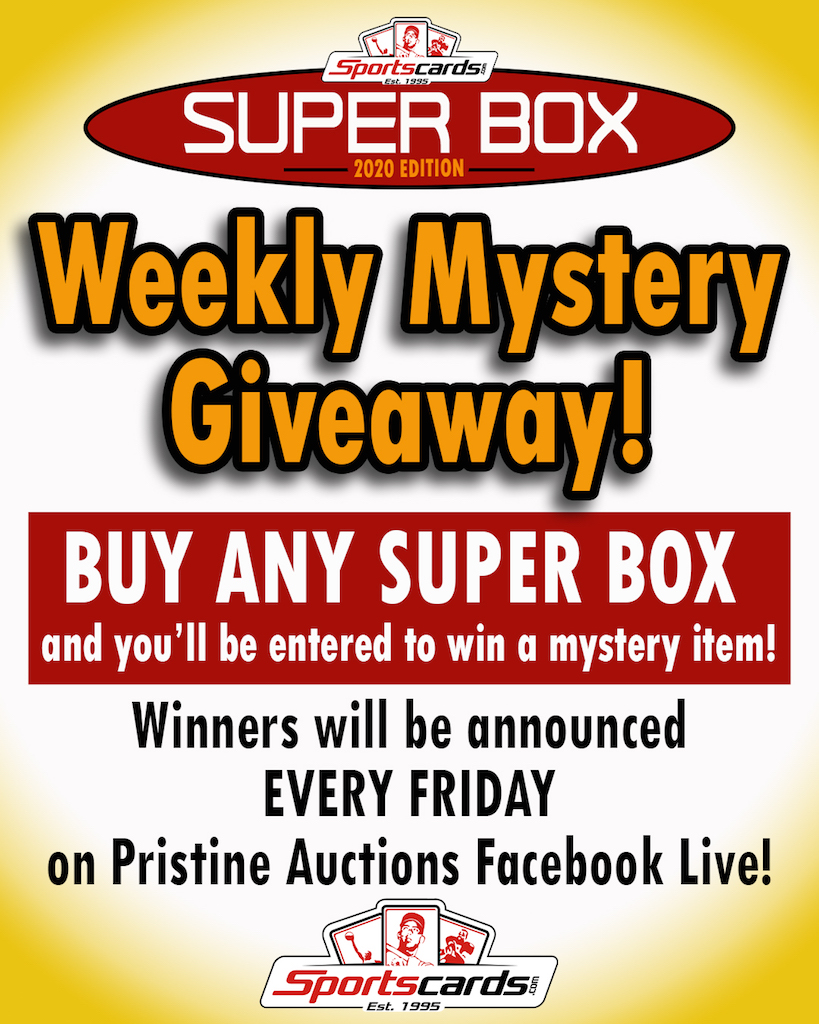 ***WEEKLY FACEBOOK LIVE BONUS GIVEAWAY***??We will be giving away even MORE STUFF each week on Pristine's weekly Facebook live session for ANYONE that bought (and paid for) a Sportscards.com Super Box (baseball, basketball, football, all sports) over the previous week (Friday to Thursday). Be sure to watch Pristine's Facebook live every Friday!