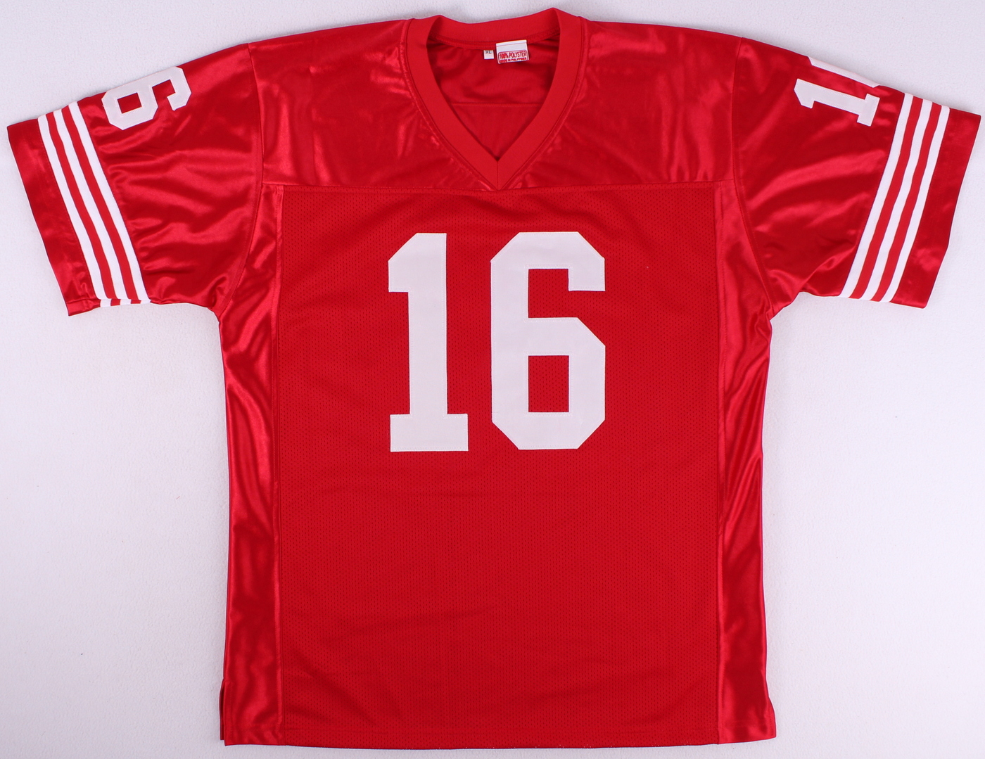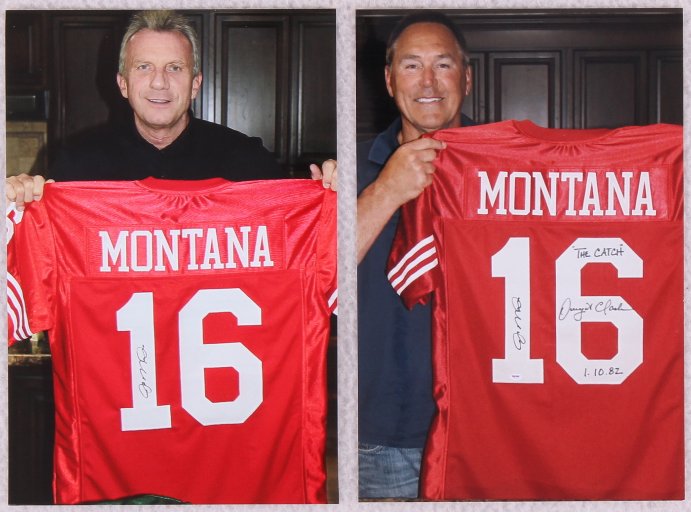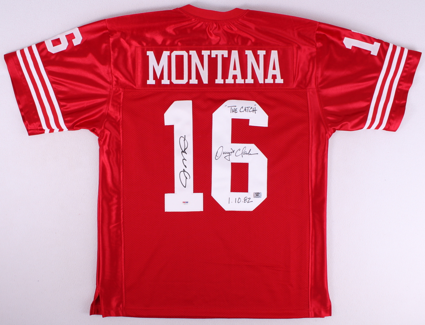 Custom on-field style Joe Montana 49ers #16 jersey. Everything is sewn on, size XL. Hand-signed in black felt tip pen by Joe Montana and Dwight Clark. Dwight Clark inscribed "The Catch 1.10.82". The autographs include an official Dwight Clark & PSA/DNA hologram and matching COA for authenticity purposes. Also includes photographs from the signing.