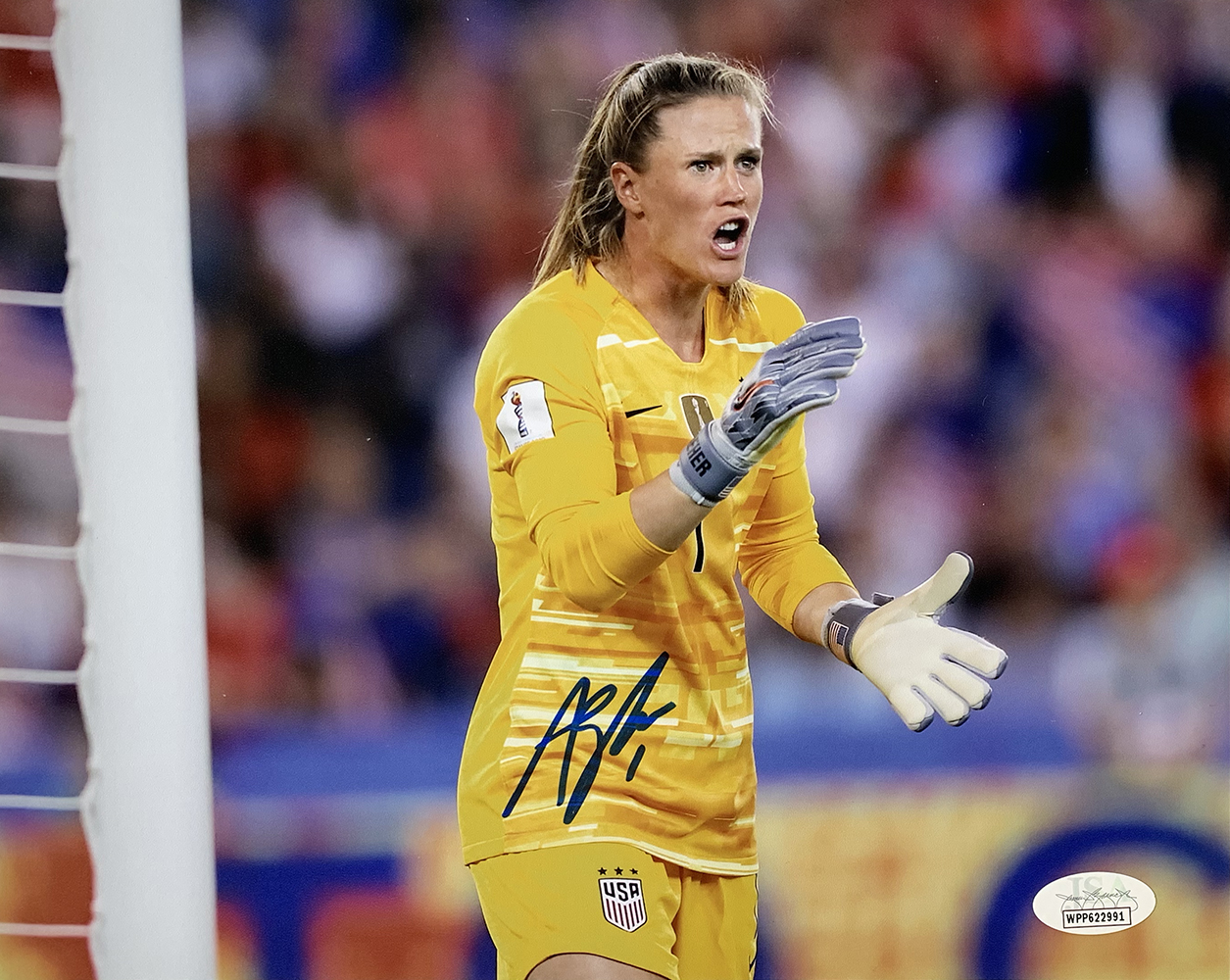 Photo measures 8" x 10" in size and has been hand-signed in blue felt-tip pen by Alyssa Naeher.