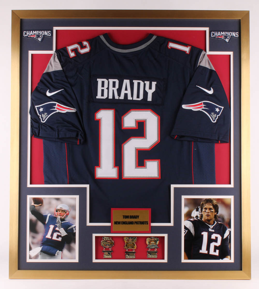 Tom Brady New England Patriots 32x36 Custom Framed Jersey with (3) Super Bowl Pins