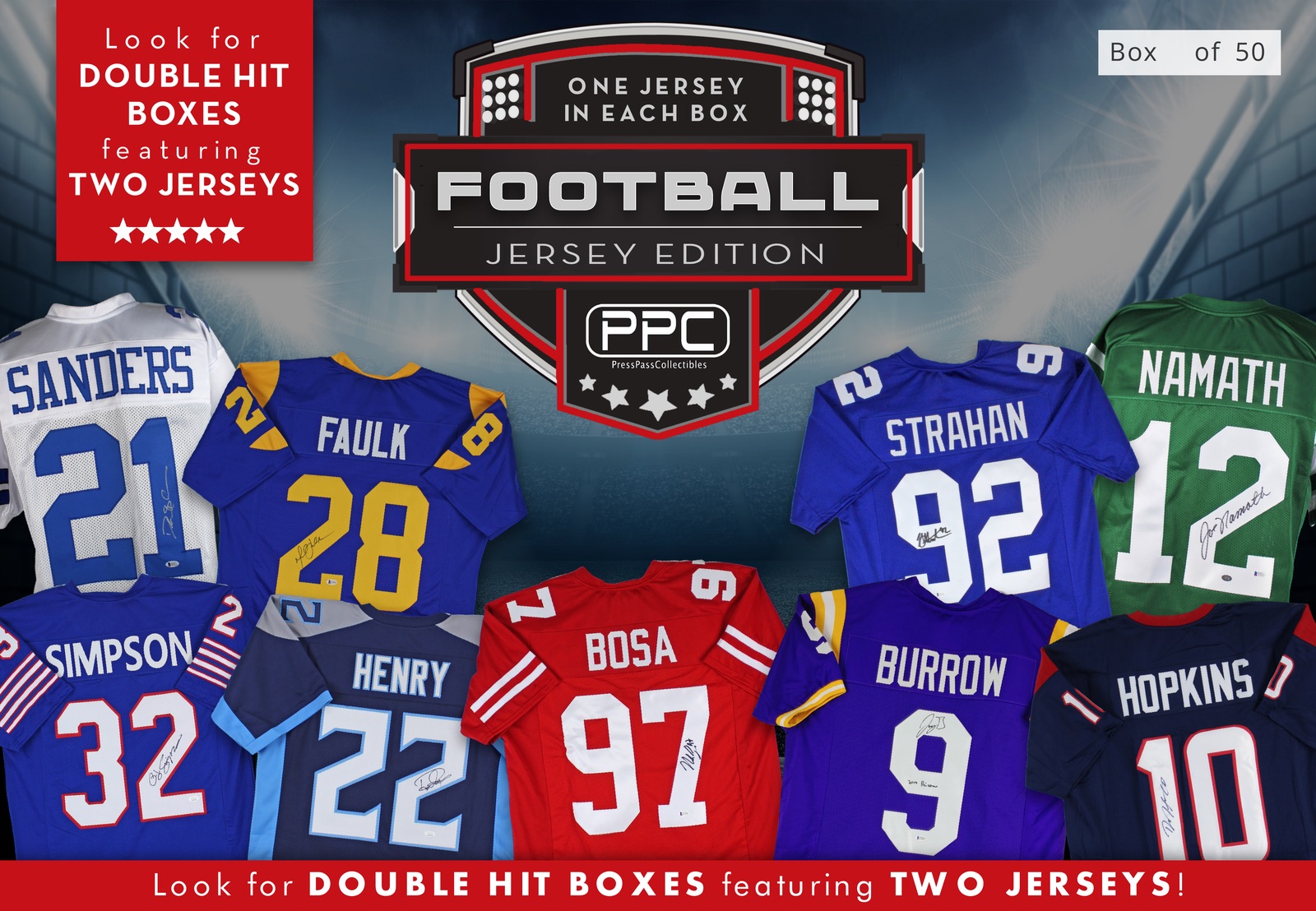 The Press Pass Collectibles 2020 Multi-Sport jersey mystery box includes one (1) custom jersey from your favorite NFL teams. Look out for boxes for the exclusive double jersey boxes scattered throughout this series. Mega hit boxes will feature jerseys signed by Joe Burrow, Travis Kelce, Derrick Henry, Joe Namath, Deion Sanders, DeAndre Hopkins and many more Stars/Hall of Famers!