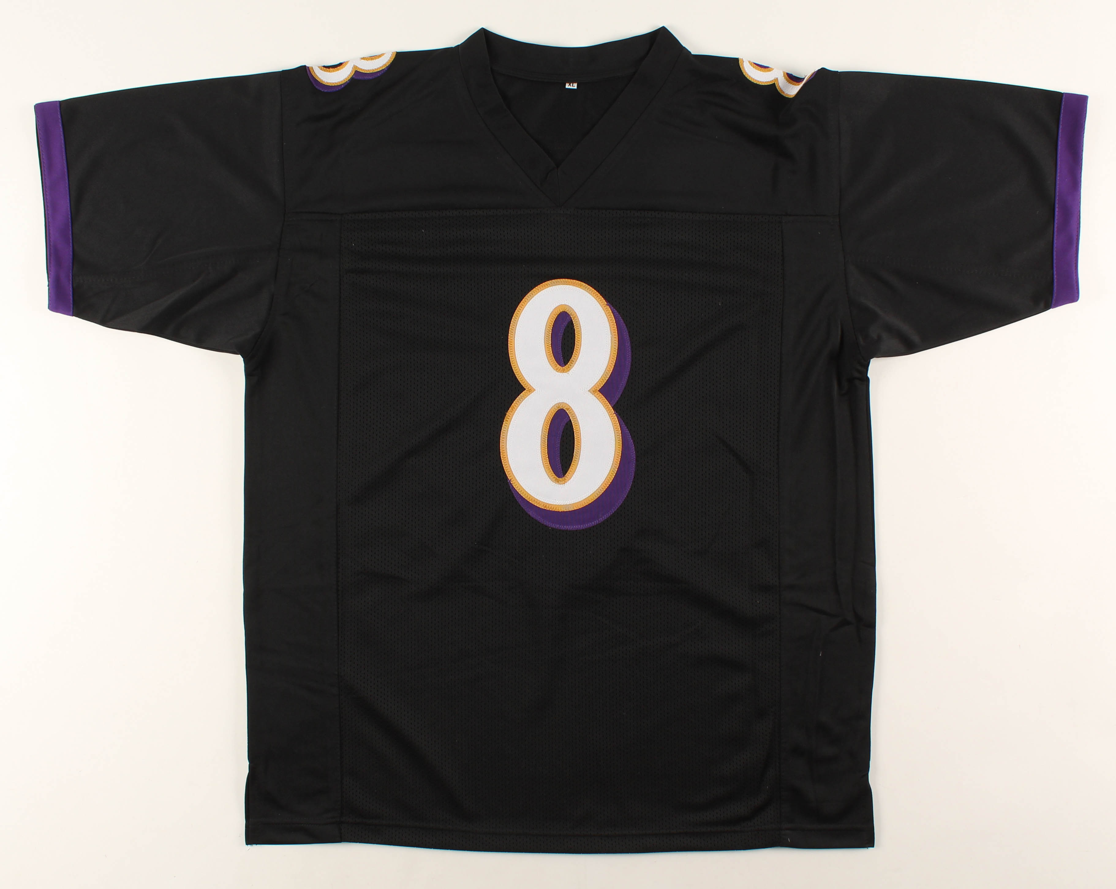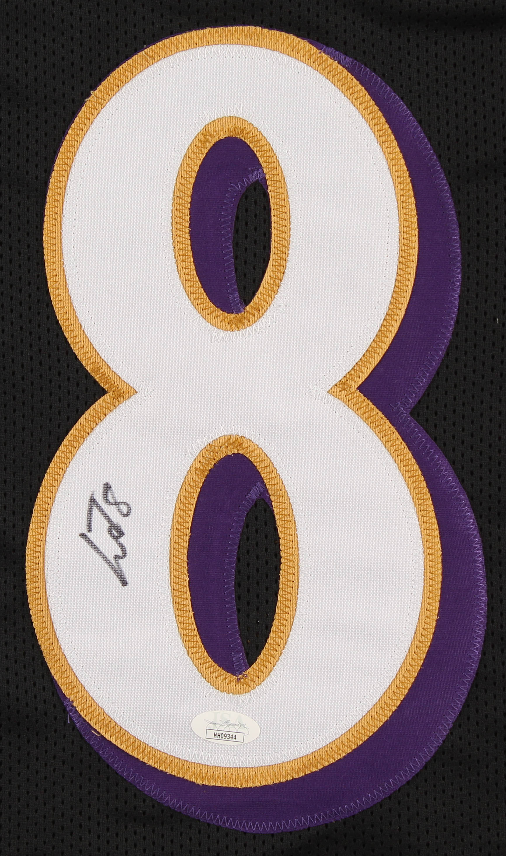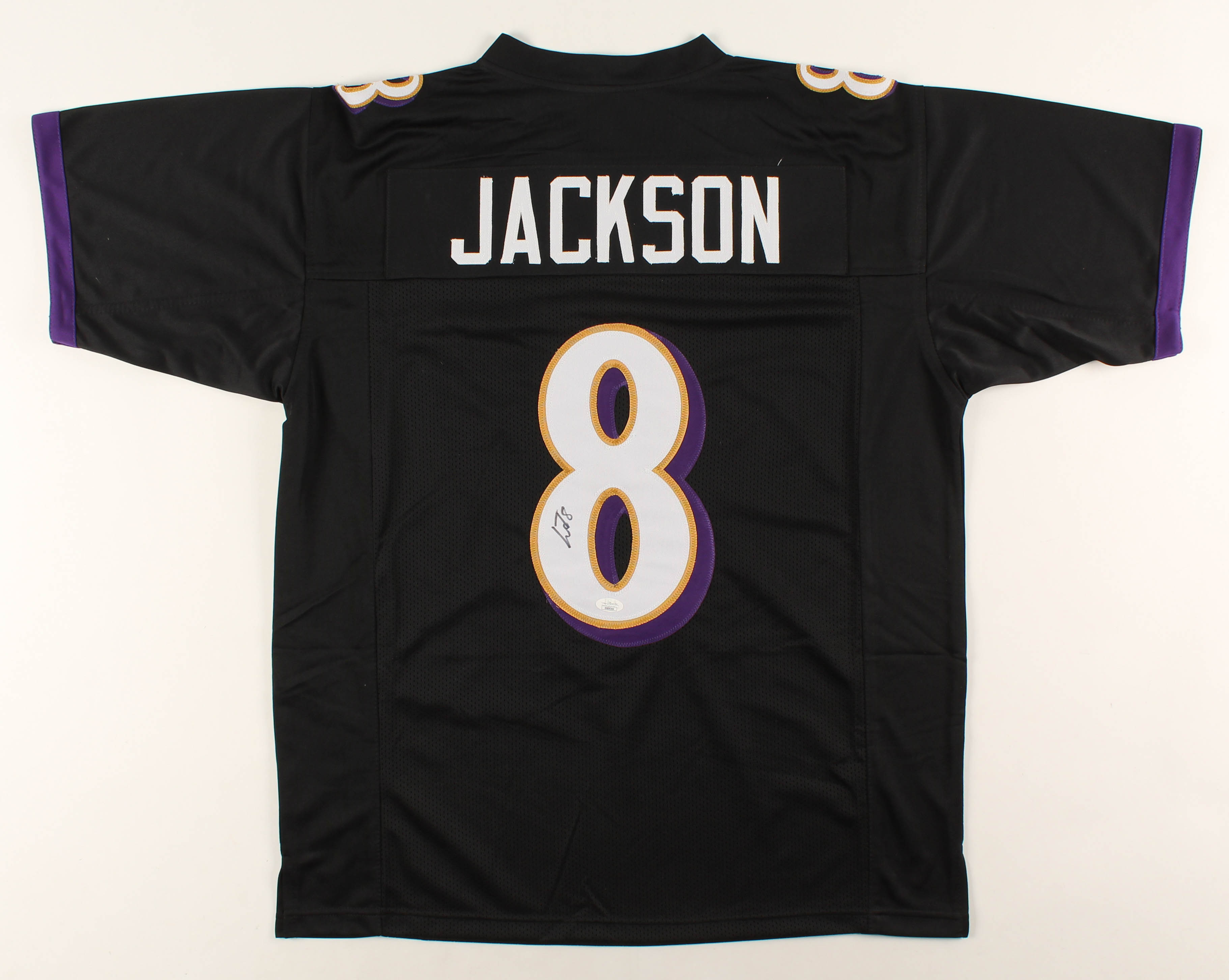 Custom on-field style jersey. Everything is sewn on, size XL. Hand-signed by Lamar Jackson.