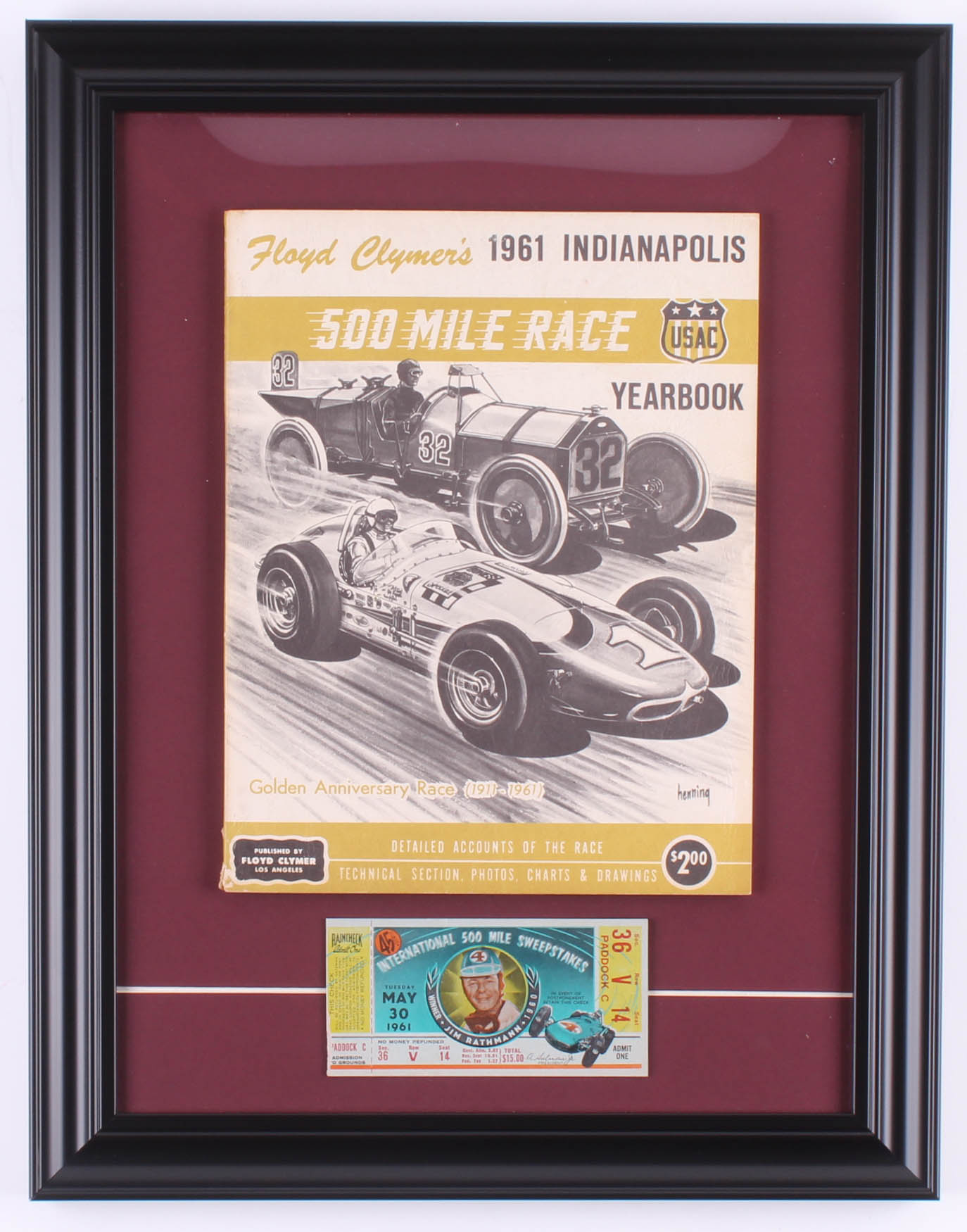 Custom frame measures 14.5" x 18.5" in size and features an original 1961 Indianapolis 500 program. Display also features an original 1961 original vintage ticket.