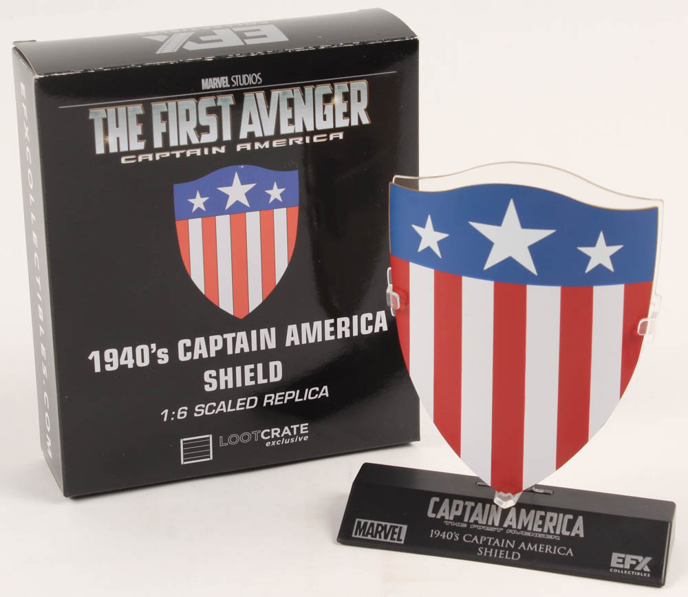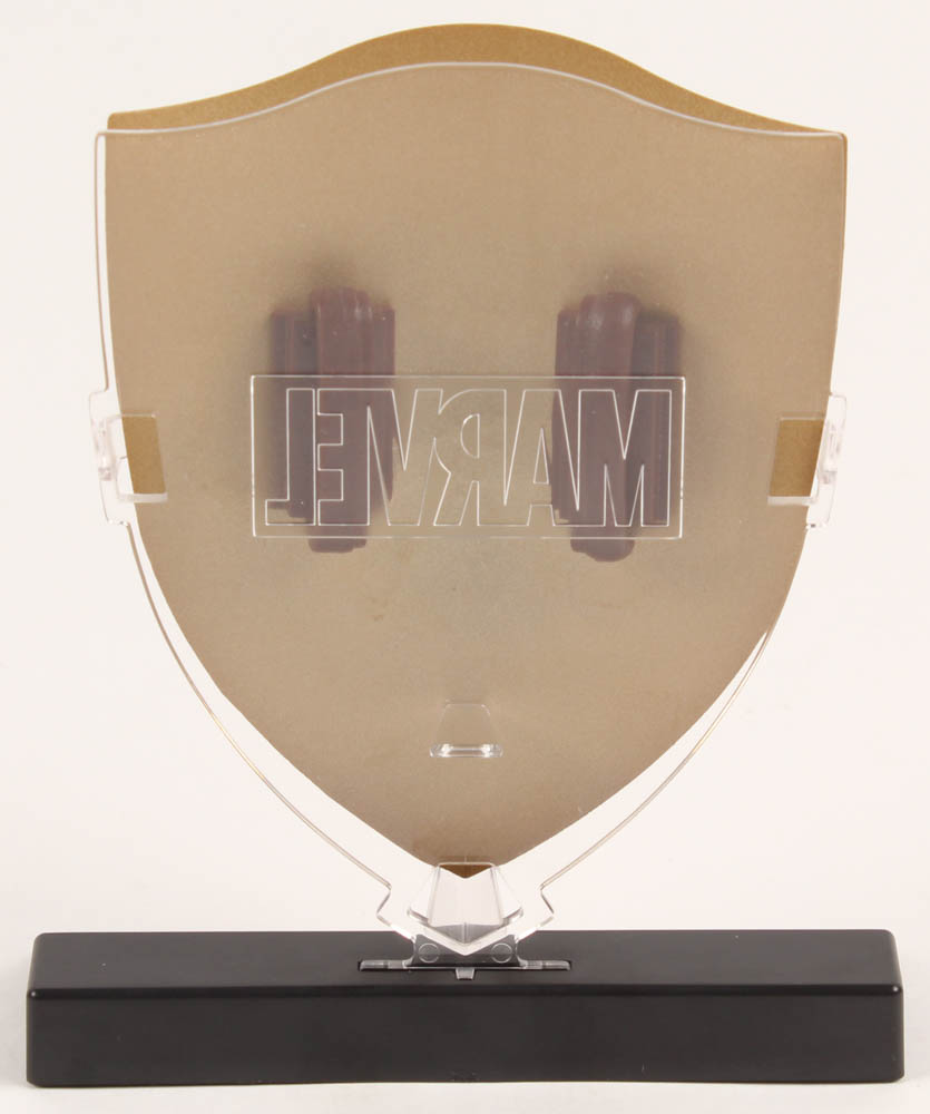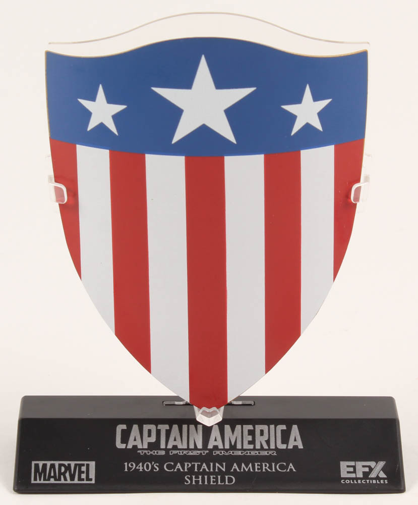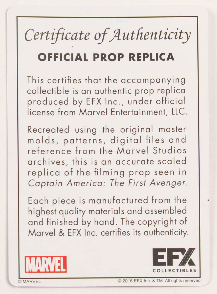 Captain America: The First Avenger movie prop replica. The prop is made of metal and measures 4.5" in height. Includes original packaging and display base as shown above. See the photos for more details regarding the condition of the prop.