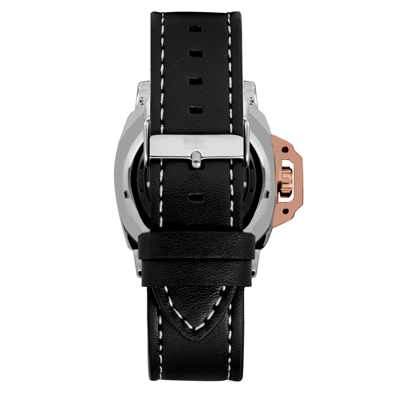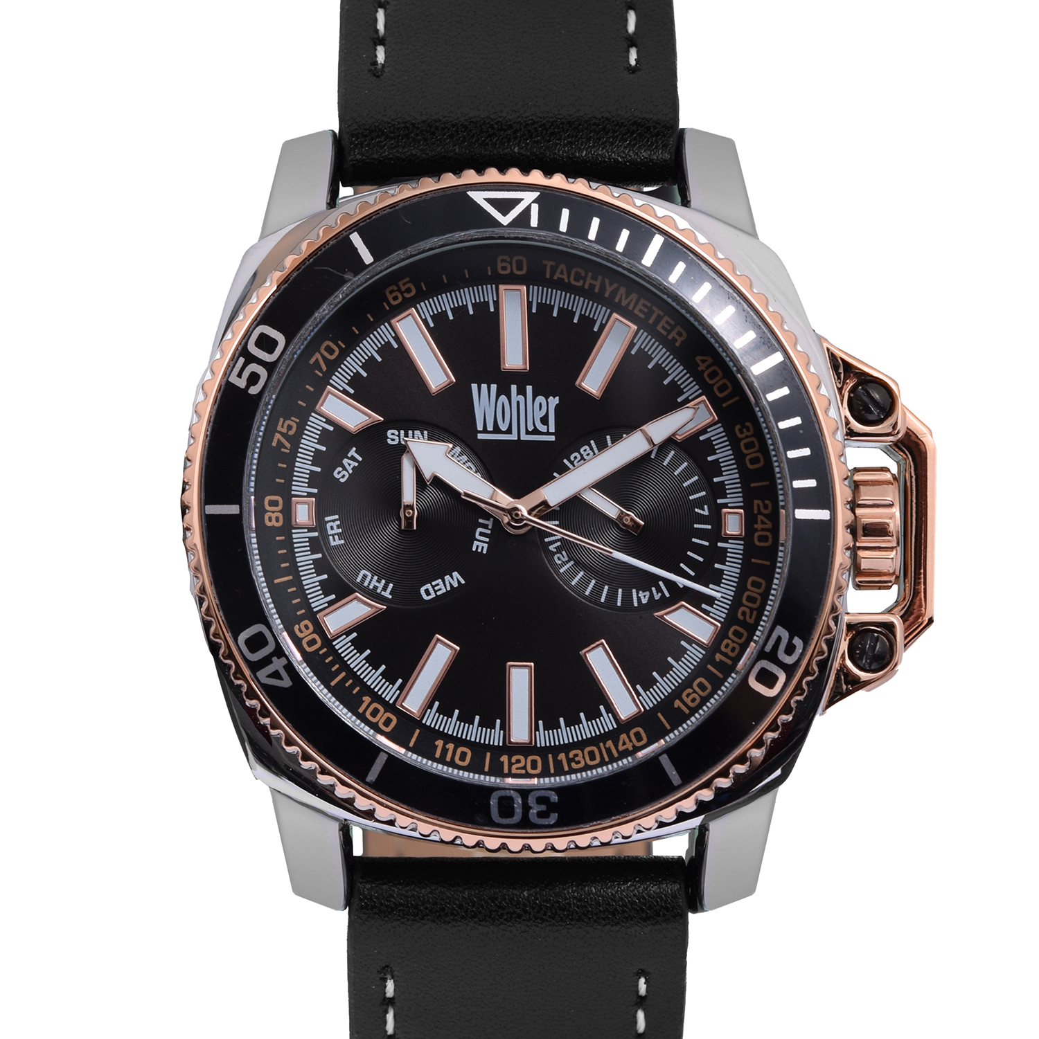 The Wohler Tribeca Men's Watch features a black leather strap, gold case and multi-function black dial. Please see photos for more details.