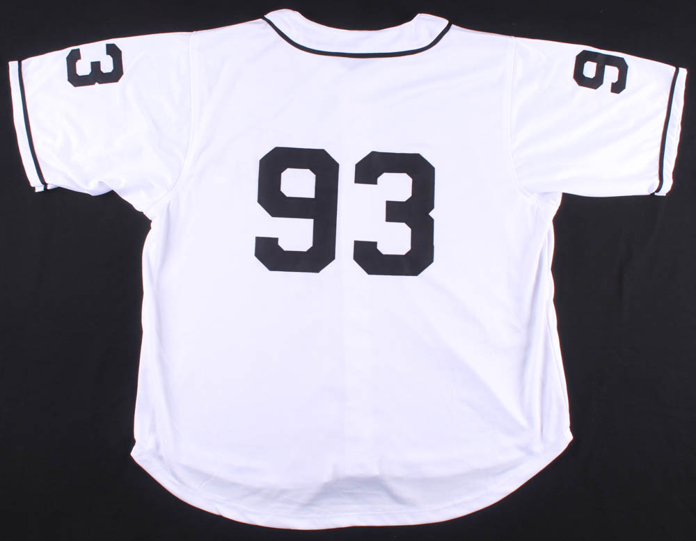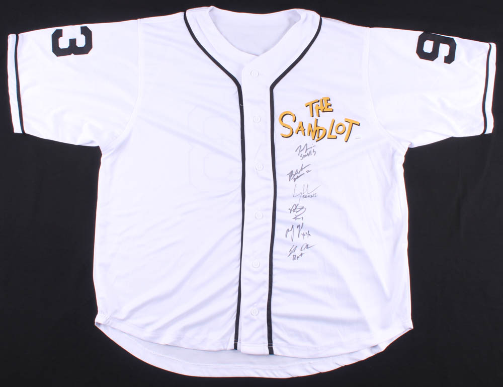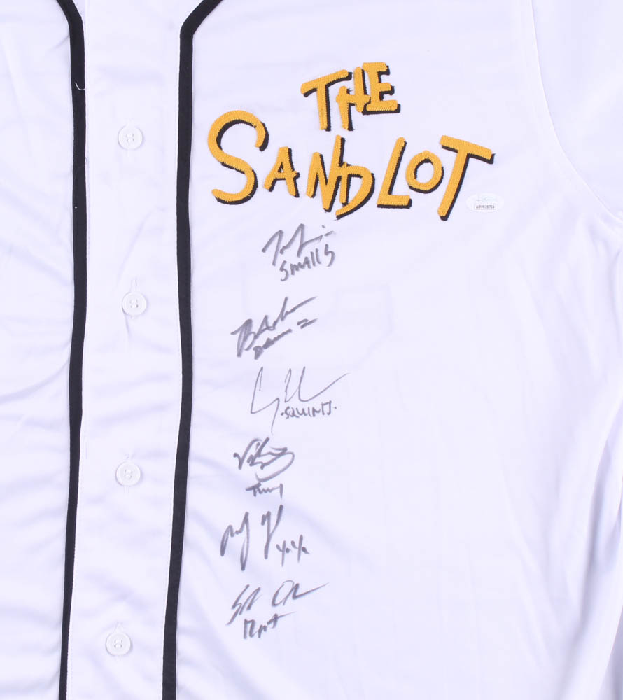 Custom on-field style jersey. Everything is sewn on, size XL. Hand-signed and inscribed in black felt-tip pen by (6) including Tom Guiry (Scotty Smalls), Chauncey Leopardi (Michael "Squints" Palledorous), Marty York (Alan "Yeah-Yeah" McClennan), Victor Di Mattia (Timmy Timmons), Shane Obedzinski (Tommy "Repeat" Timmons), and Brandon Quintin Adams (Kenny DeNunez).