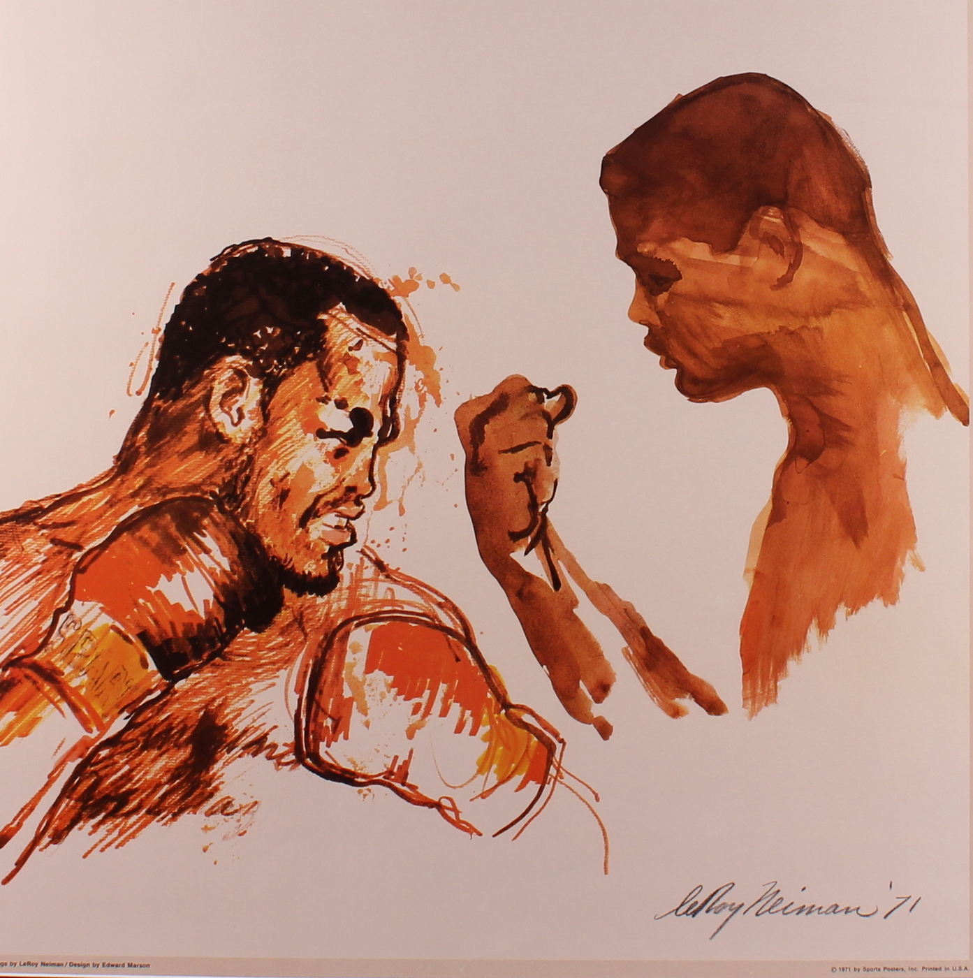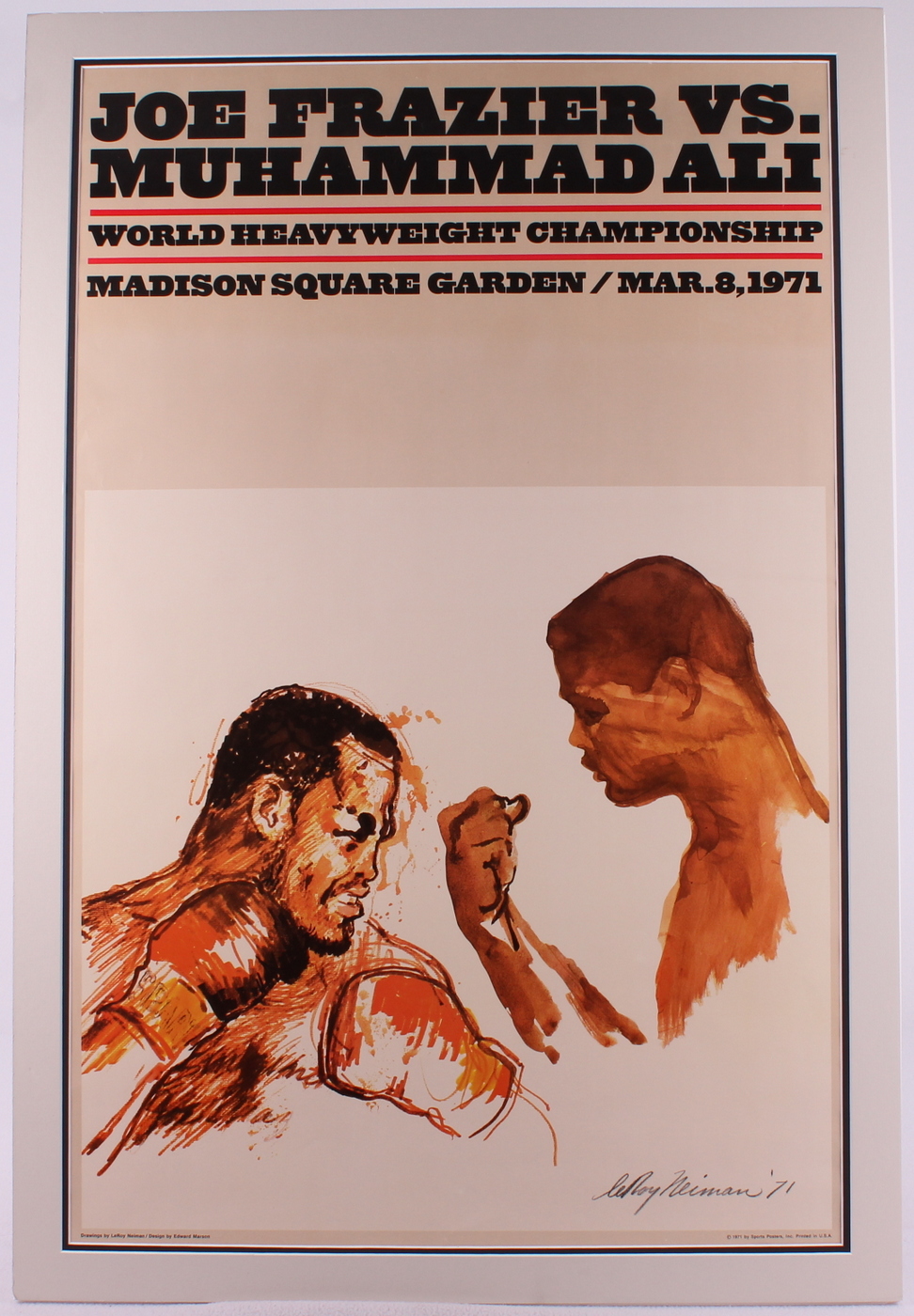 Depicting the Fight of the Century should make this the Poster of the Century. Fight of the Century was the promotional nickname given to the first boxing match between champion Joe Frazier (26-0, 23 KOs) and challenger Muhammad Ali (31-0, 25 KOs), held on March 8, 1971, at Madison Square Garden in New York City. Frazier defeated Ali in the 15th round by unanimous decision. This powerful 24-by-36-inch poster depicts Ali (gloveless) face to face with Frazier (gloved). The top of the poster reads "JOE FRAZIER vs. MUHAMMAD ALI, World Heavyweight Championship, Madison Square Garden/Mar. 8, 1971”. This Leroy Neiman original poster is in remarkable condition for its age, showing only light handling wear throughout and comes matted to an overall size of 27” x 40”.