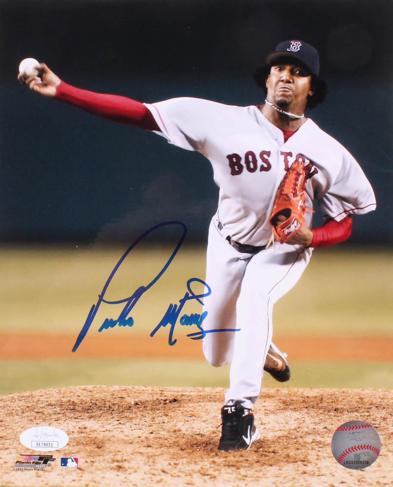 Photo measures 8" x 10" in size and has been hand-signed in blue felt-tip pen by Pedro Martinez (Boston Red Sox, HOF).